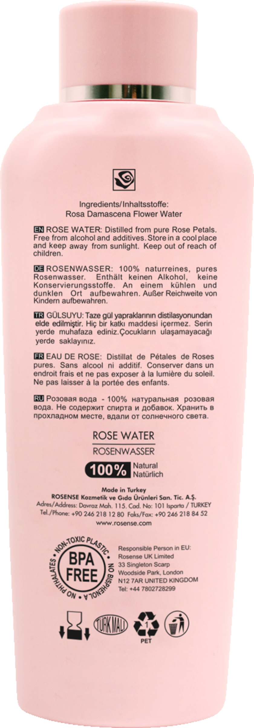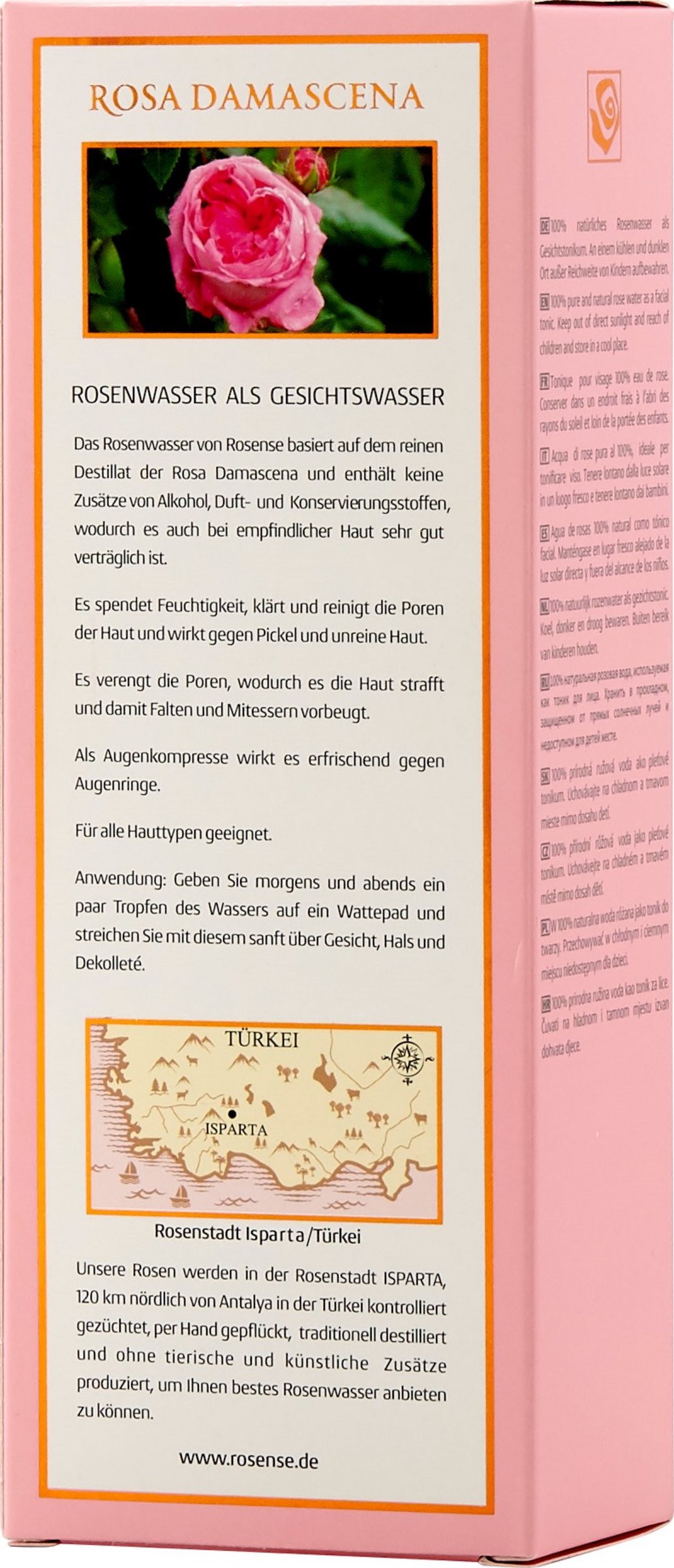 Das Rosenwasser von Rosense basiert auf dem reinen Destillat der Rosa damascena und enthält keinen Alkohol, keine Konservierungsstoffe, keine künstlichen Duft- oder Farbstoffe, wodurch es auch bei empfindlicher Haut sehr gut verträglich ist. Es spendet Feuchtigkeit, klärt und reinigt die Poren der Haut und wirkt gegen Pickel und unreine Haut. Es verengt die Poren, wodurch es die Haut strafft und damit Falten und Mitessern vorbeugt. Als Augenkompresse wirkt es erfrischend gegen Augenringe.
