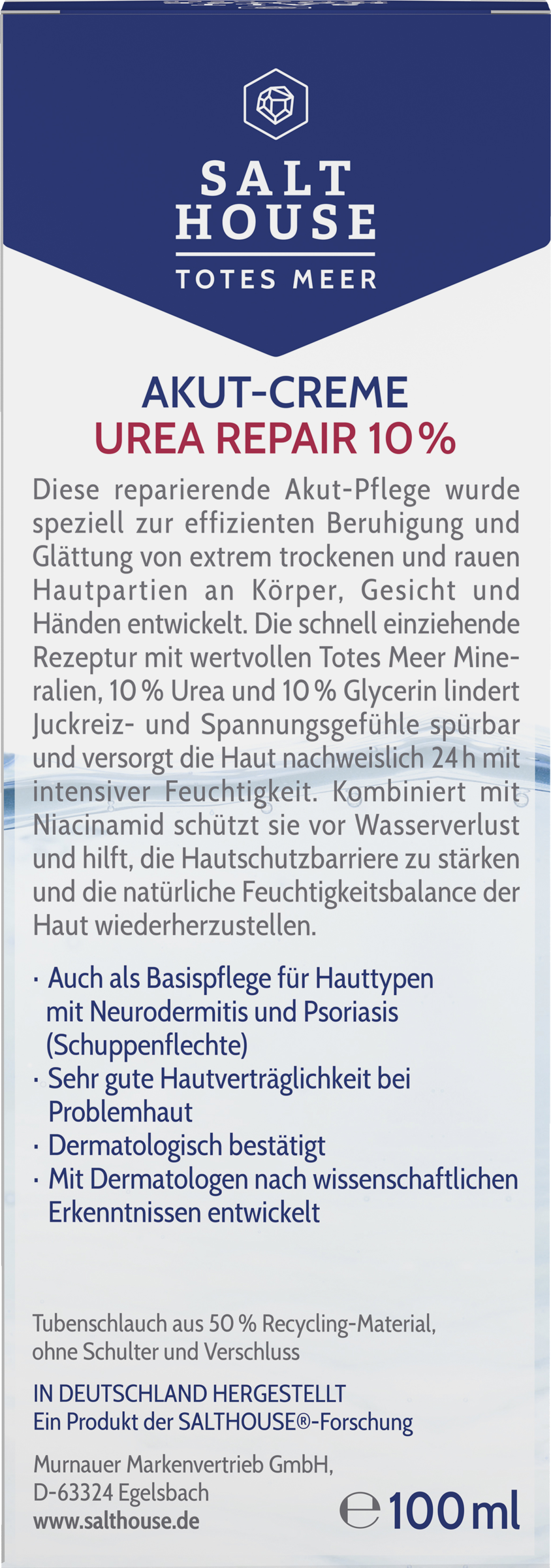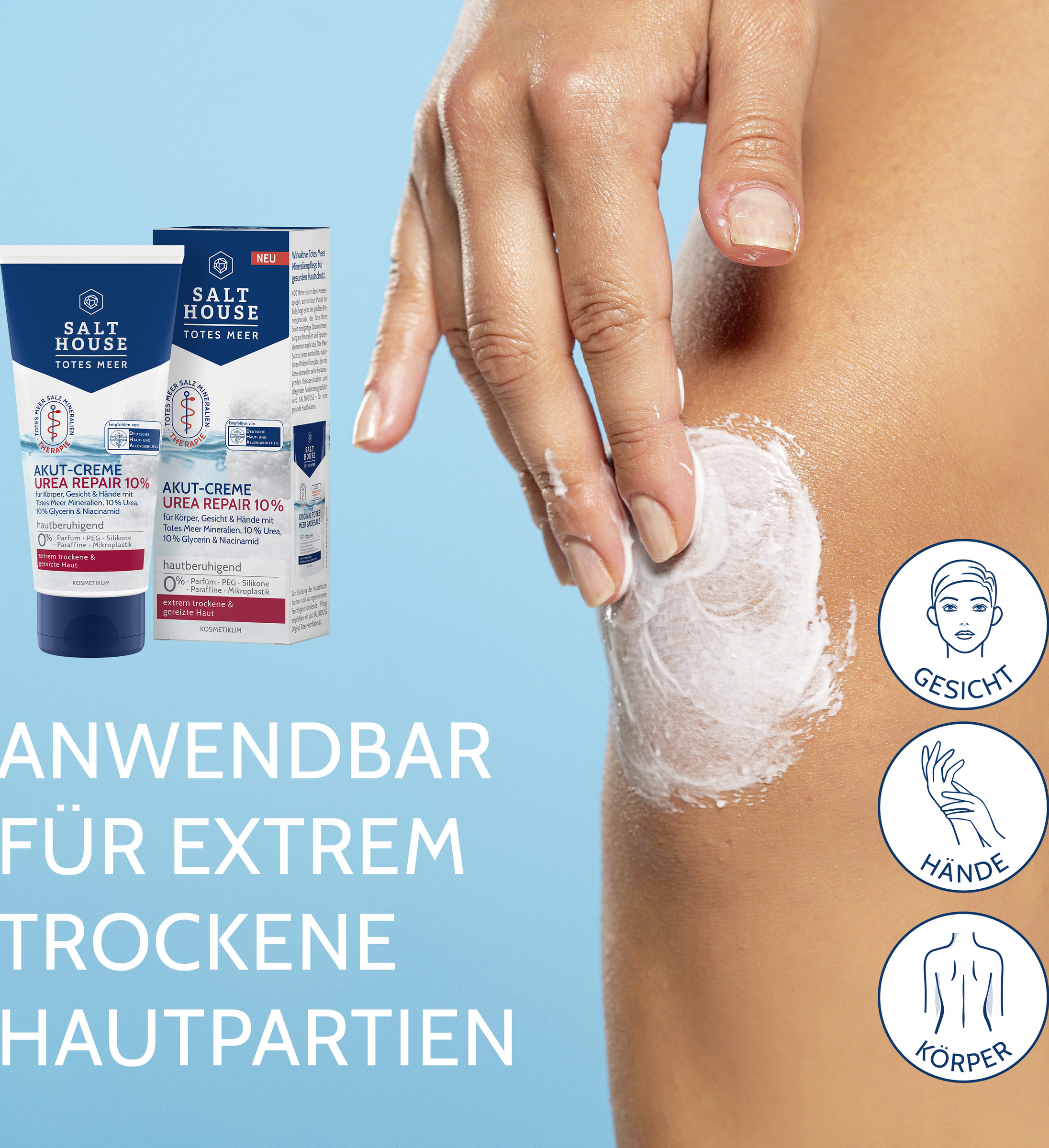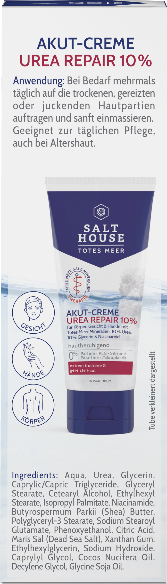 Diese reparierende Akut-Pflege wurde speziell zur effizienten Beruhigung und Glättung von extrem trockenen und rauen Hautpartien an Körper, Gesicht und Händen entwickelt. Die schnell einziehende Rezeptur mit wertvollen Totes Meer Mineralien, 10 % Urea und 10 % Glycerin lindert Juckreiz- und Spannungsgefühle spürbar und versorgt die Haut nachweislich 24h mit intensiver Feuchtigkeit. Kombiniert mit Niacinamid schützt sie vor Wasserverlust und hilft, die Hautschutzbarriere zu stärken und den natürlichen Feuchtigkeitsgehalt der Haut wiederherzustellen.