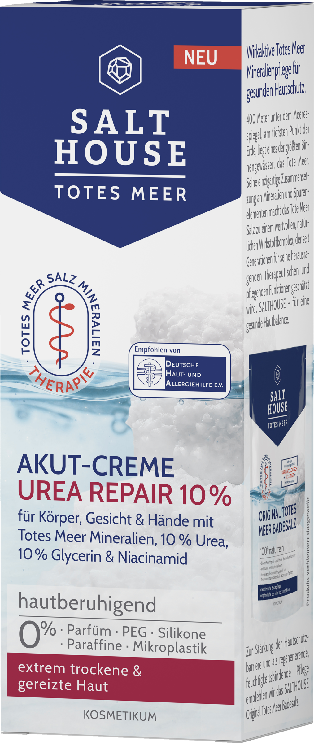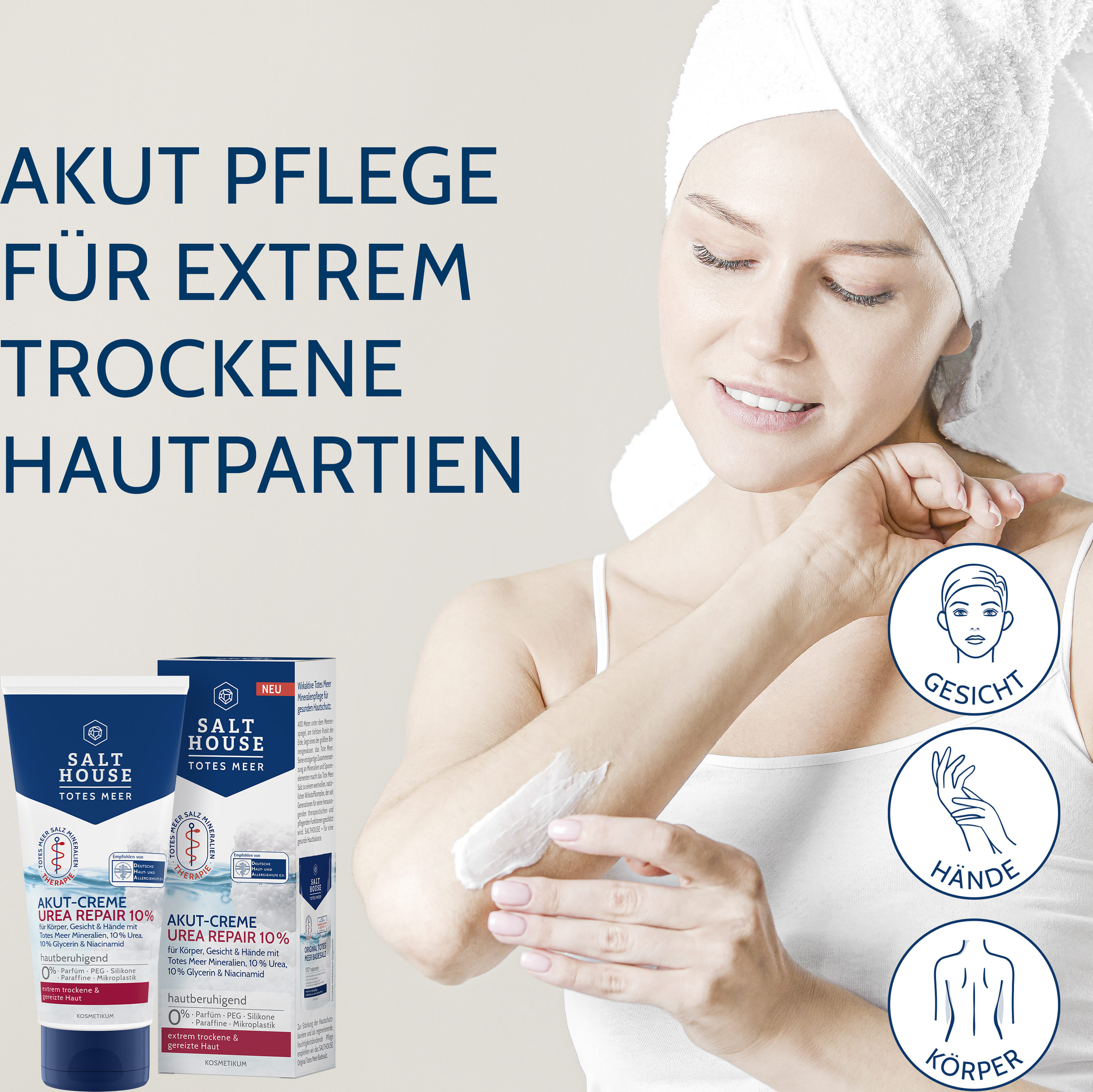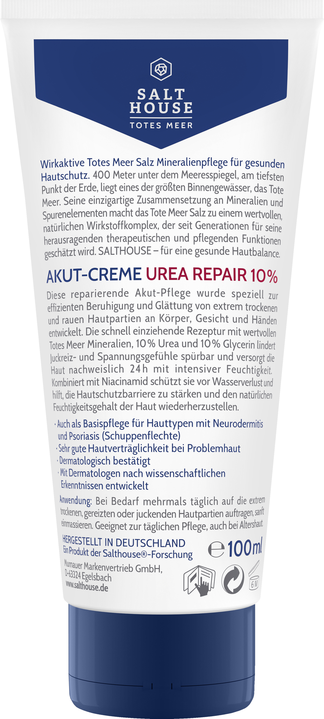 Diese reparierende Akut-Pflege wurde speziell zur effizienten Beruhigung und Glättung von extrem trockenen und rauen Hautpartien an Körper, Gesicht und Händen entwickelt. Die schnell einziehende Rezeptur mit wertvollen Totes Meer Mineralien, 10 % Urea und 10 % Glycerin lindert Juckreiz- und Spannungsgefühle spürbar und versorgt die Haut nachweislich 24h mit intensiver Feuchtigkeit. Kombiniert mit Niacinamid schützt sie vor Wasserverlust und hilft, die Hautschutzbarriere zu stärken und den natürlichen Feuchtigkeitsgehalt der Haut wiederherzustellen.