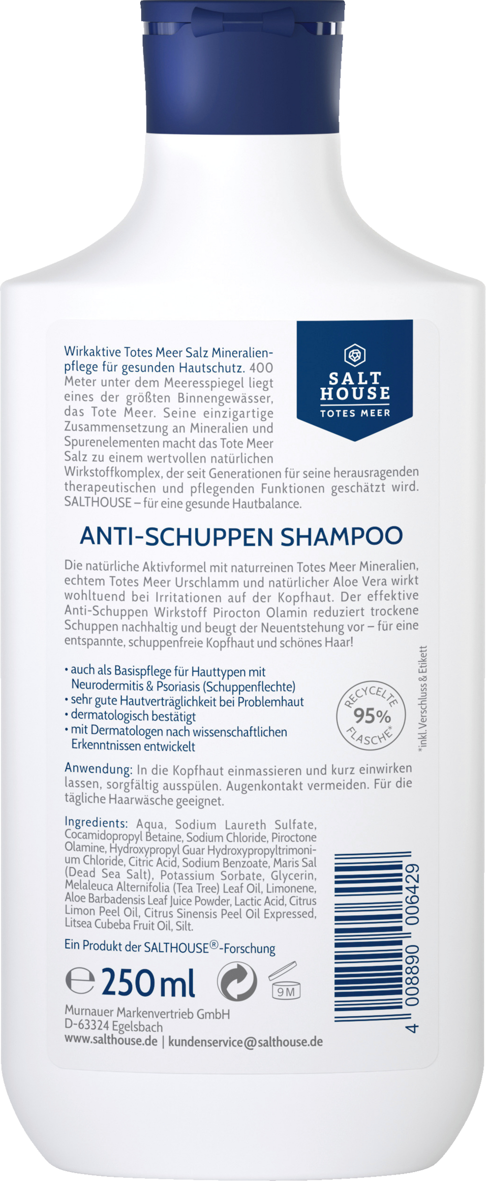 Die natürliche Aktivformel mit naturreinen Totes Meer Mineralien, echtem Totes Meer Urschlamm und natürlicher Aloe Vera wirkt wohltuend bei Irritationen auf der Kopfhaut. Der effektive Anti-Schuppen Wirkstoff Pirocton Olamin reduziert trockene Schuppen nachhaltig und beugt der Neuentstehung vor – für eine entspannte, schuppenfreie Kopfhaut und schönes Haar!