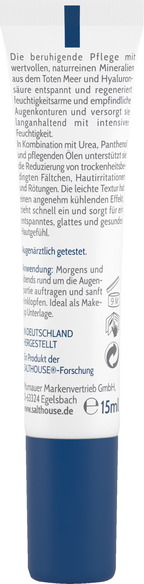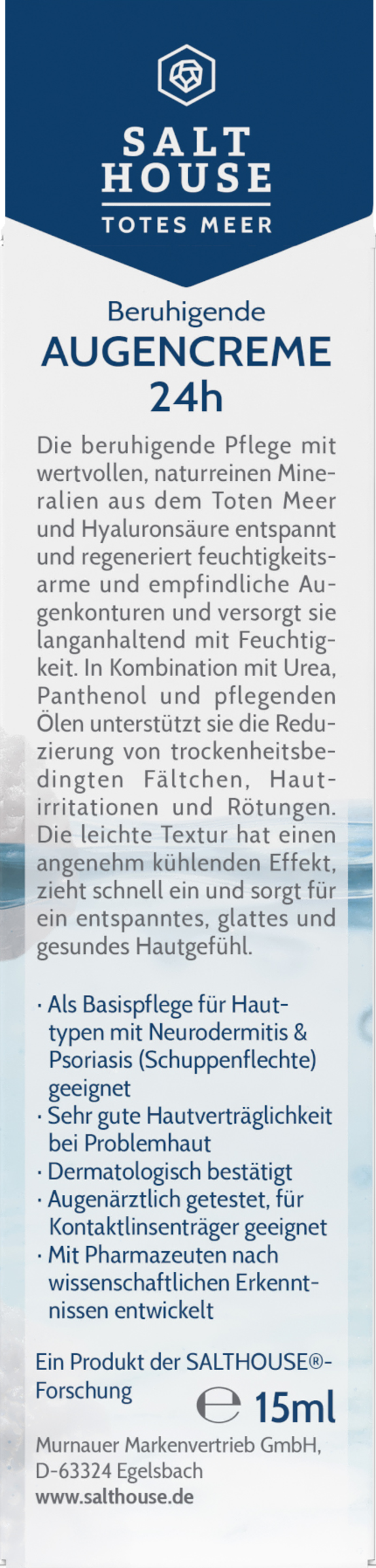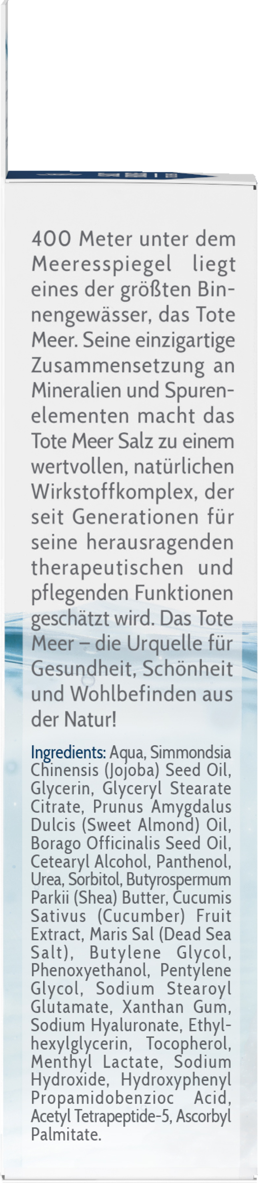 Kühlende, reichhaltige Pflege mit Totes Meer Salz Mineralien und Hyaluron. Als Basispflege auch für Hauttypen mit Neurodermitis und Psoriasis geeignet. pH-hautneutral, dermatologisch und augenärztlich getestet. Ohne Parfum, Farbstoffe und Paraffine.