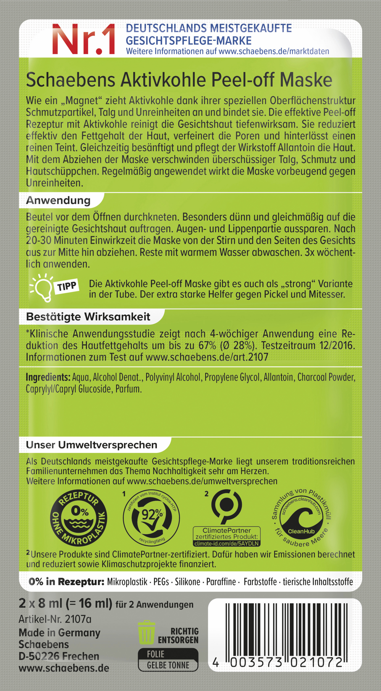Aqua, Alcohol Denat., Polyvinyl Alcohol, Propylene Glycol, Allantoin, Charcoal Powder, Caprylyl/Capryl Glucoside, Limonene, Linalool, Parfum.