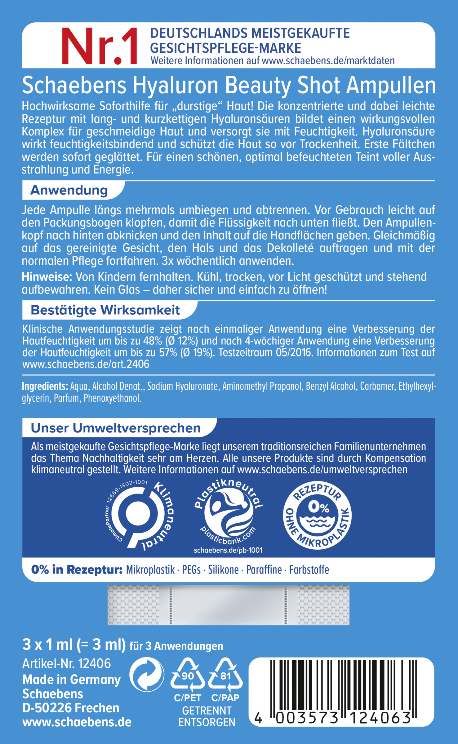 Jede Ampulle an der Längsperforation mehrmals umbiegen und dann abtrennen oder abschneiden. Vor Gebrauch leicht auf den Packungsbogen klopfen, damit die Flüssigkeit nach unten fließt. Den Ampullenkopf nach hinten abknicken und den Beauty Shot auf die Handfläche geben. Gleichmäßig auf das gereinigte Gesicht, den Hals und das Dekolleté geben. Leicht einmassieren, einige Minuten einwirken lassen, dann mit der normalen Pflege fortfahren. Für ein optimales Pflegeergebnis empfehlen wir eine regelmäßige Anwendung.