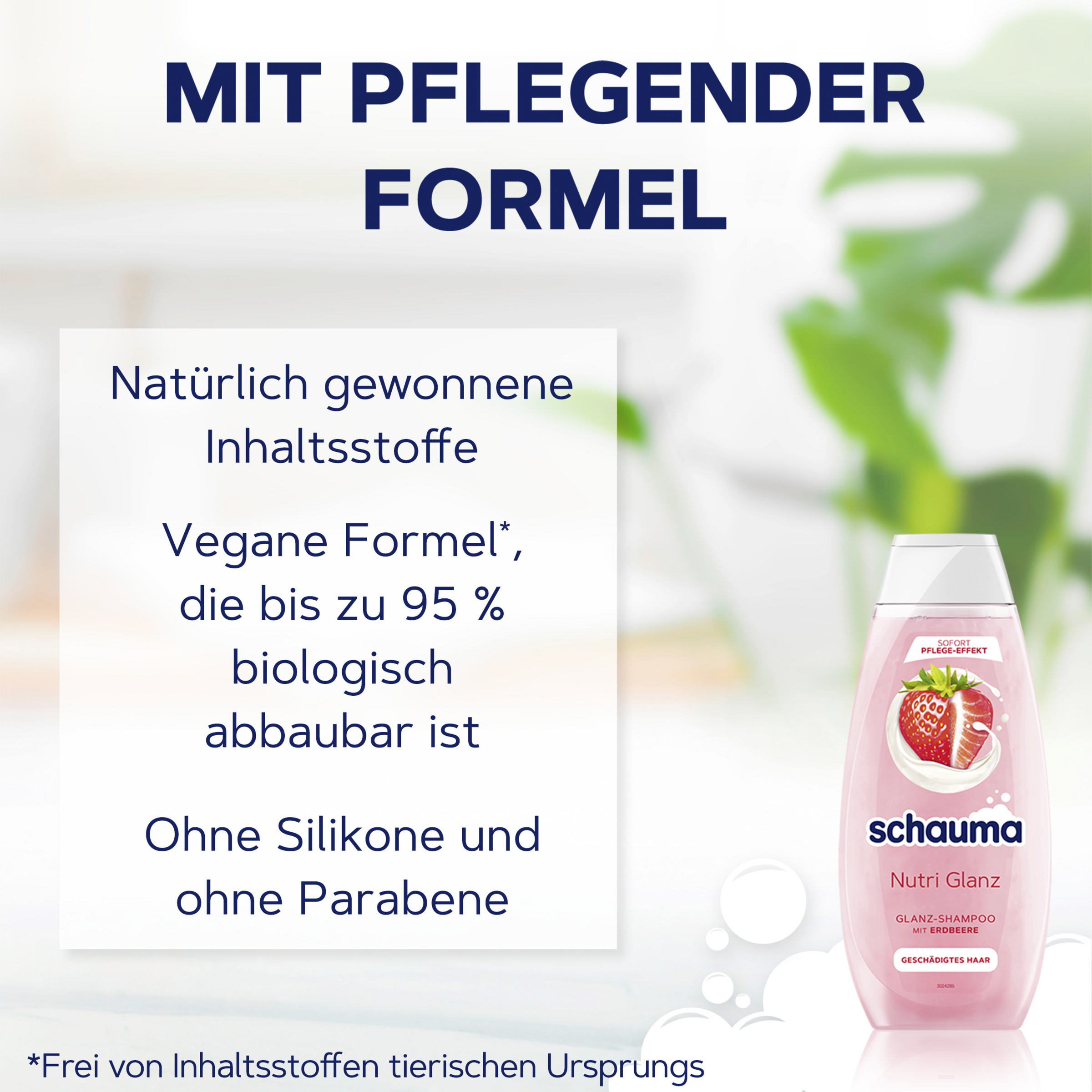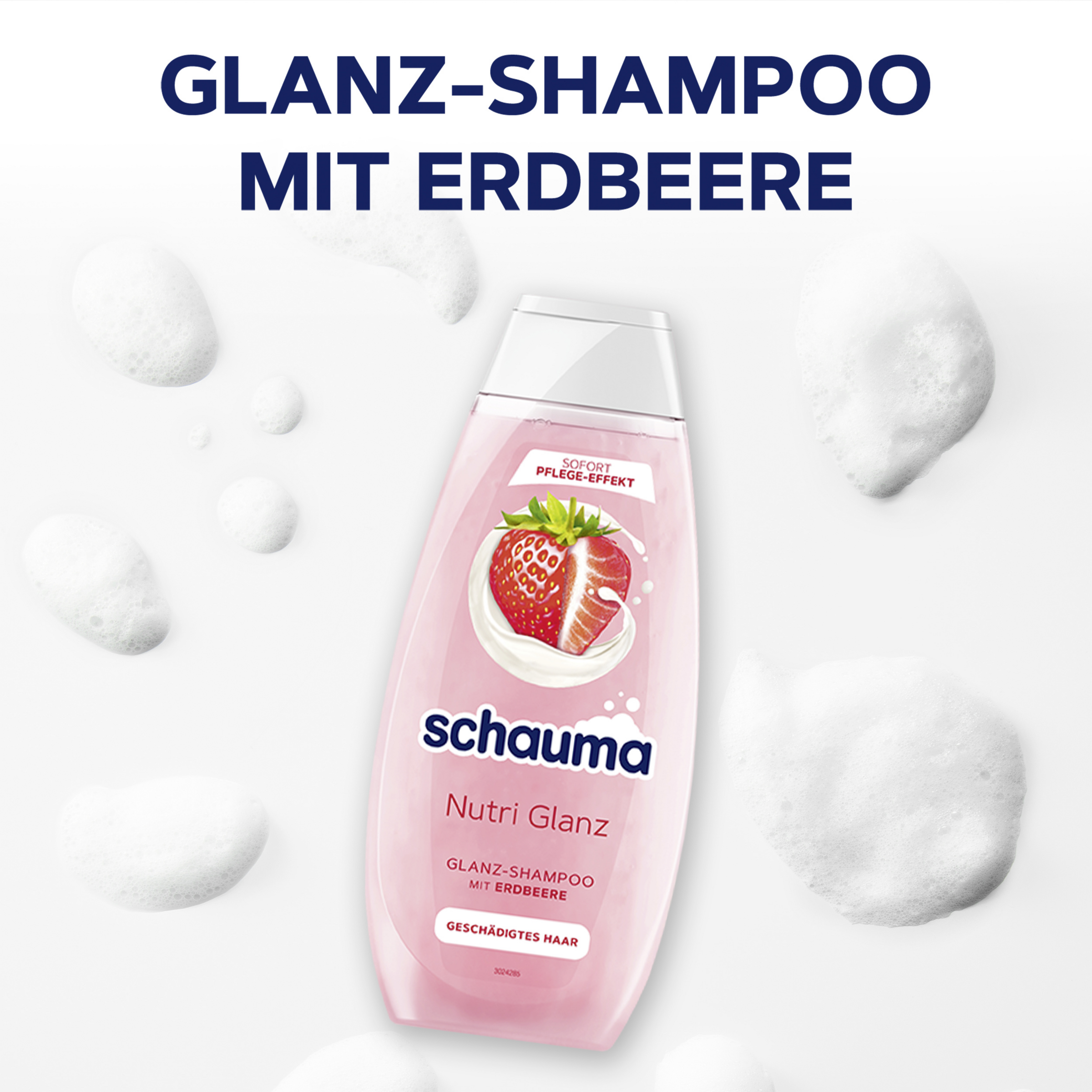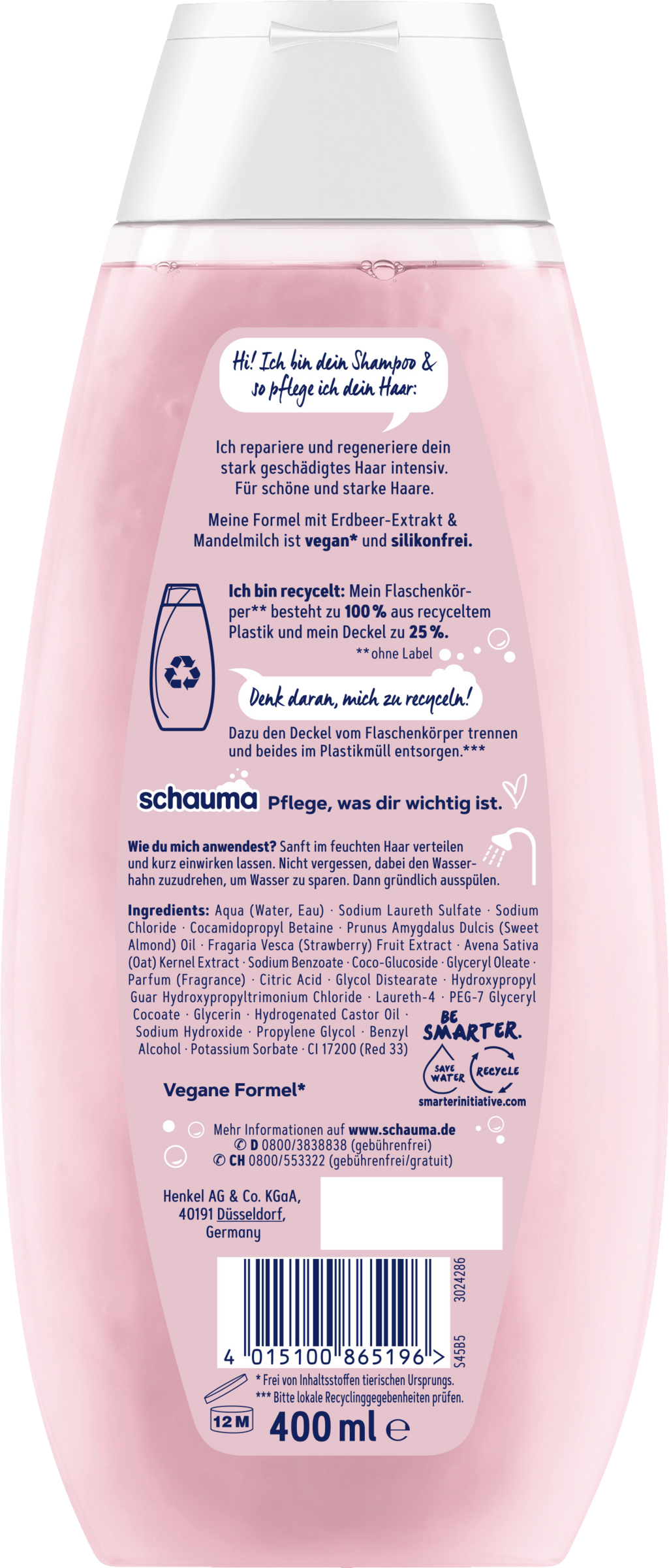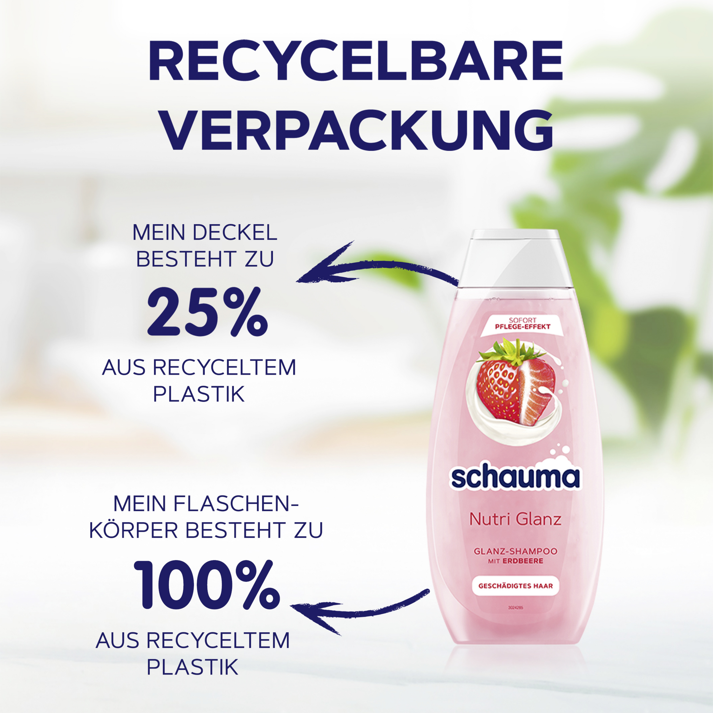 Das SCHAUMA Shampoo Nutri Glanz mit Erdbeer-Extrakt und Mandelmilch repariert und regeneriert stark geschädigtes Haar intensiv – für schöne und starke Haare. Die Formel ist vegan* und silikonfrei. Dank Sofort-Pflege-Effekt erhalten die Haare schon ab der ersten Anwendung ein gepflegteres Aussehen und Gefühl. Die Shampooflasche besteht zu 100 %** aus recyceltem Plastik, während der Verschluss bereits zu 25 % aus recyceltem Plastik besteht. Be smart. Recycle.