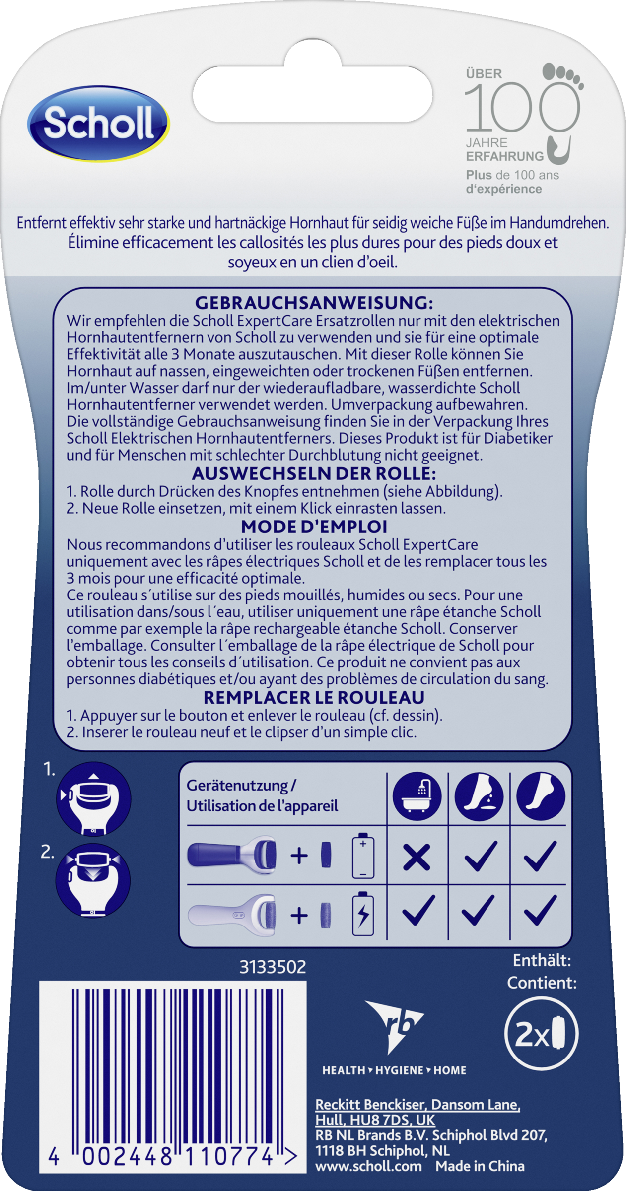Sie empfehlen die Scholl ExpertCare Ersatzrollen nur mit den elektrischen Hornhautentfernern von Scholl zu verwenden und sie für eine optimale Effektivität alle 3 Monate auszutauschen. Mit dieser Rolle können Sie Hornhaut auf nassen, eingeweichten oder trockenen Füßen entfernen. Im/unter Wasser darf nur der wiederaufladbare, wasserdichte Scholl Hornhautentferner verwendet werden.