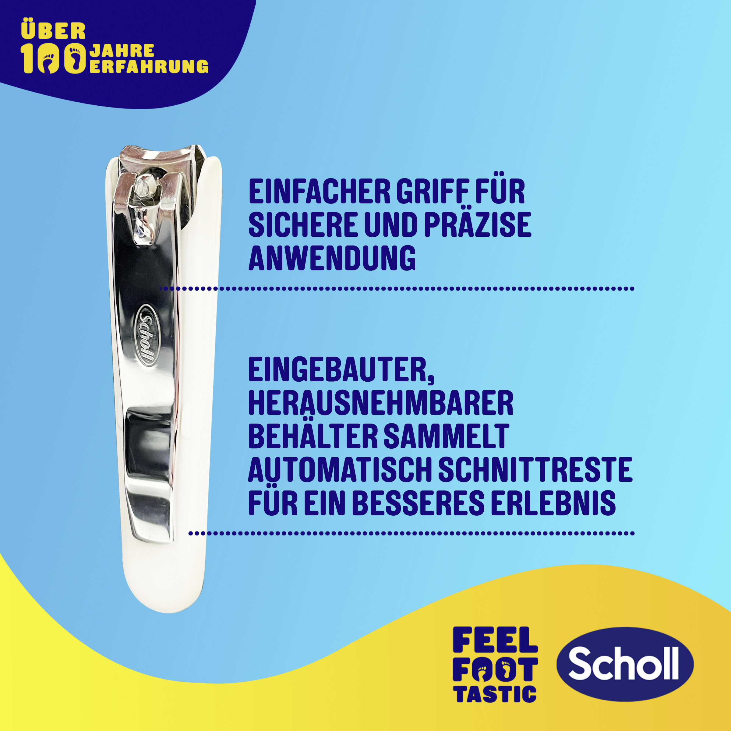 Der Scholl Nagel-Clip reduziert mit seinem Hebelystem den Kraftaufwand beim Schneiden der Fußnägel spürbar. Auf diese Weise können selbst harte und dicke Fußnägel einfach und komfortabel gekürzt werden.