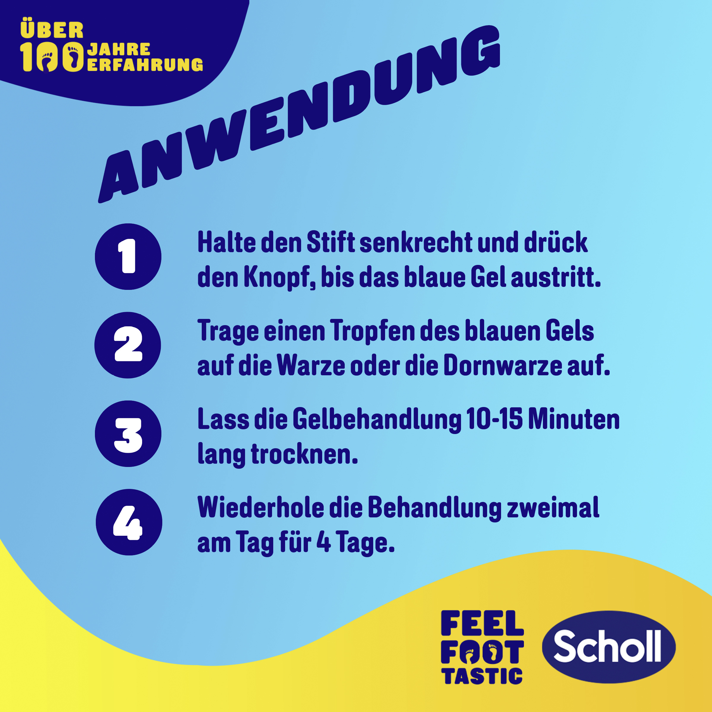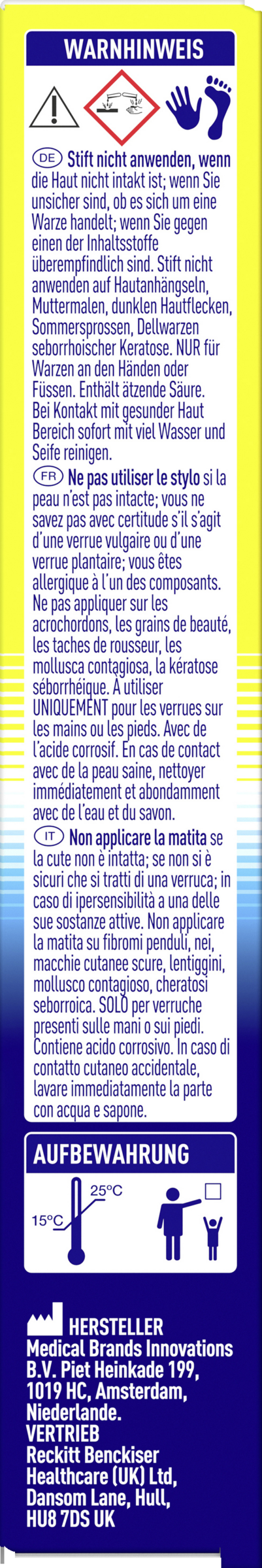 Erwachsene und Kinder ab 4 Jahren. Während der Schwangerschaft, in der Stillzeit oder im Fall von Hauterkrankungen halten Sie bitte Rücksprache mit Ihrem Hausarzt. Stift nicht anwenden, wenn die Haut nicht intakt ist, wenn Sie unsicher sind, ob es sich umeine Warze handelt, wenn Sie gegen einen der Inhaltsstoffe überempfindlich sind. Stift nicht anwenden auf Hautanhängseln, Muttermalen, dunklen Hautflecken, Sommersprossen, Dellwarzen seborrhoischer Keratose. NUR für Warzen an den Händen oder Füssen. Enthält ätzende Säure. Bei Kontaktmit gesunder Haut Bereich sofortmit viel Wasser und Seife reinigen.Dieses Produkt ist NICHT für die Anwendung bei Diabetes oder Durchblutungsstörungen geeignet. Bitte konsultieren Sie einen Arzt oder Podologen.