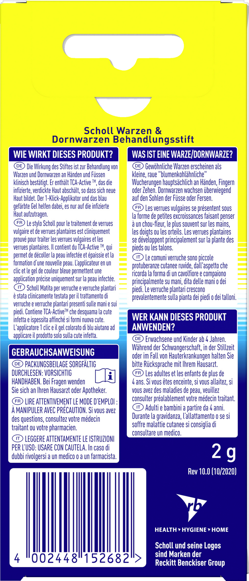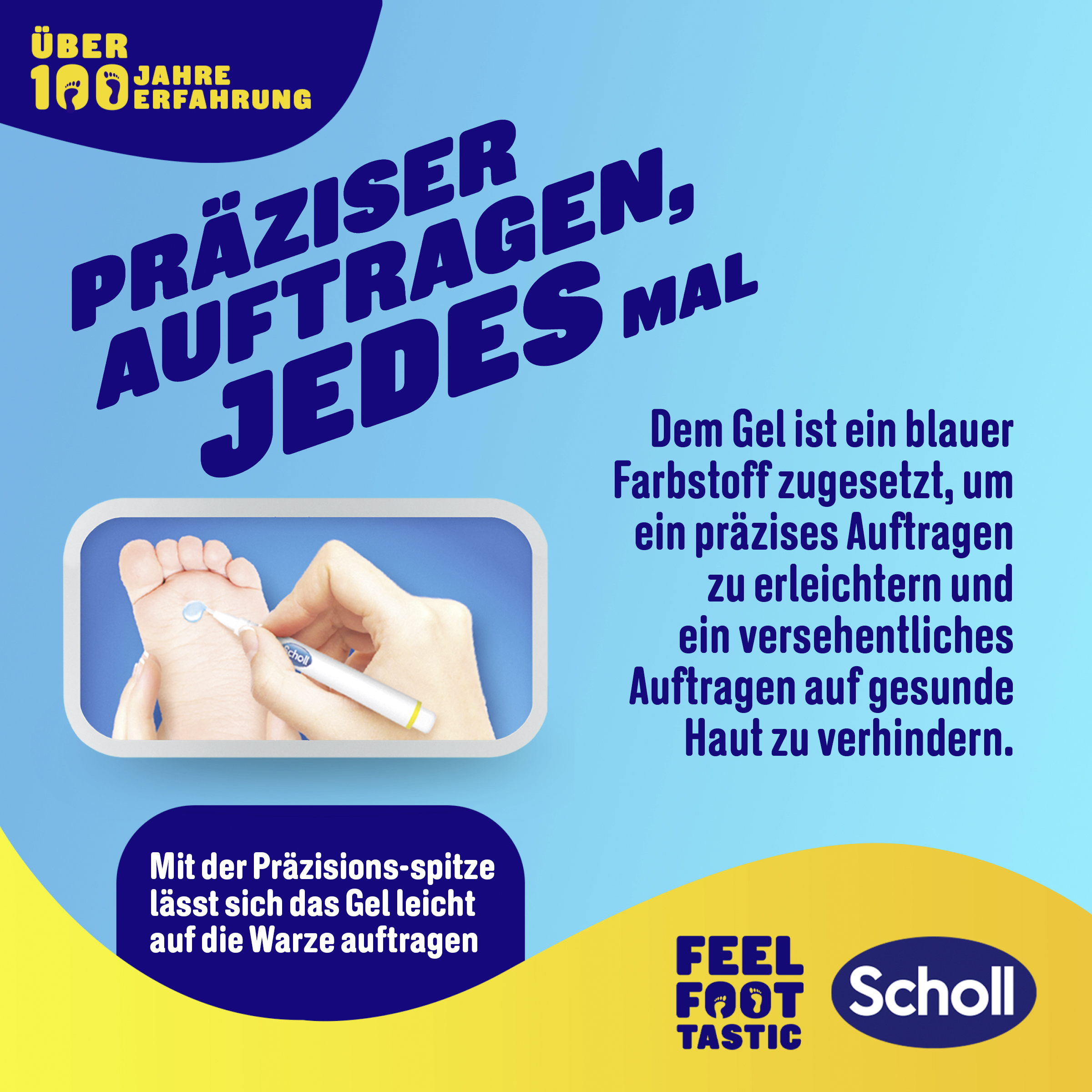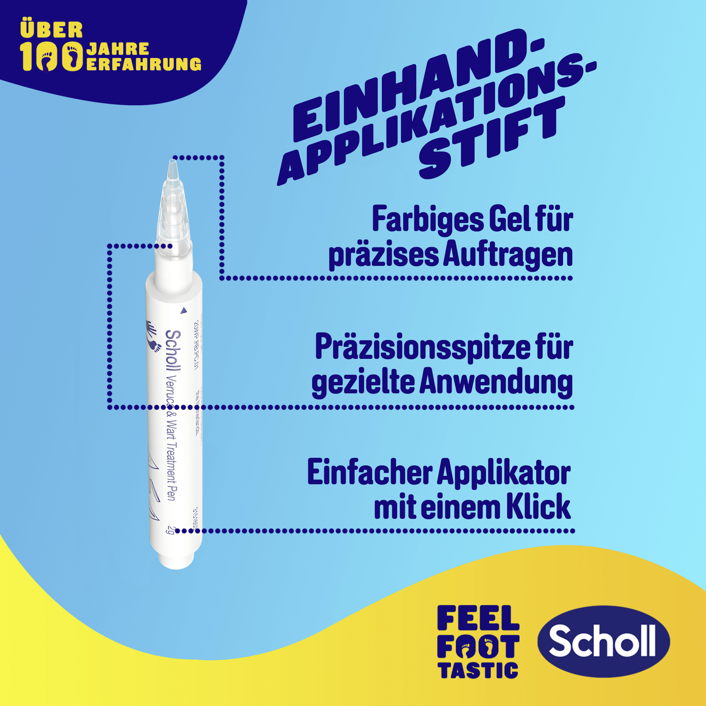 Die Wirkung des Stiftes ist zur Behandlung von Warzen und Dornwarzen an Händen und Füssen klinisch bestätigt. Er enthält TCA-Active™, das die infizierte, verdickte Haut abschält, so dass sich neue Haut bildet. Der 1-Klick-Applikator und das blau gefärbte Gel helfen dabei, es nur auf die infizierte Haut aufzutragen.