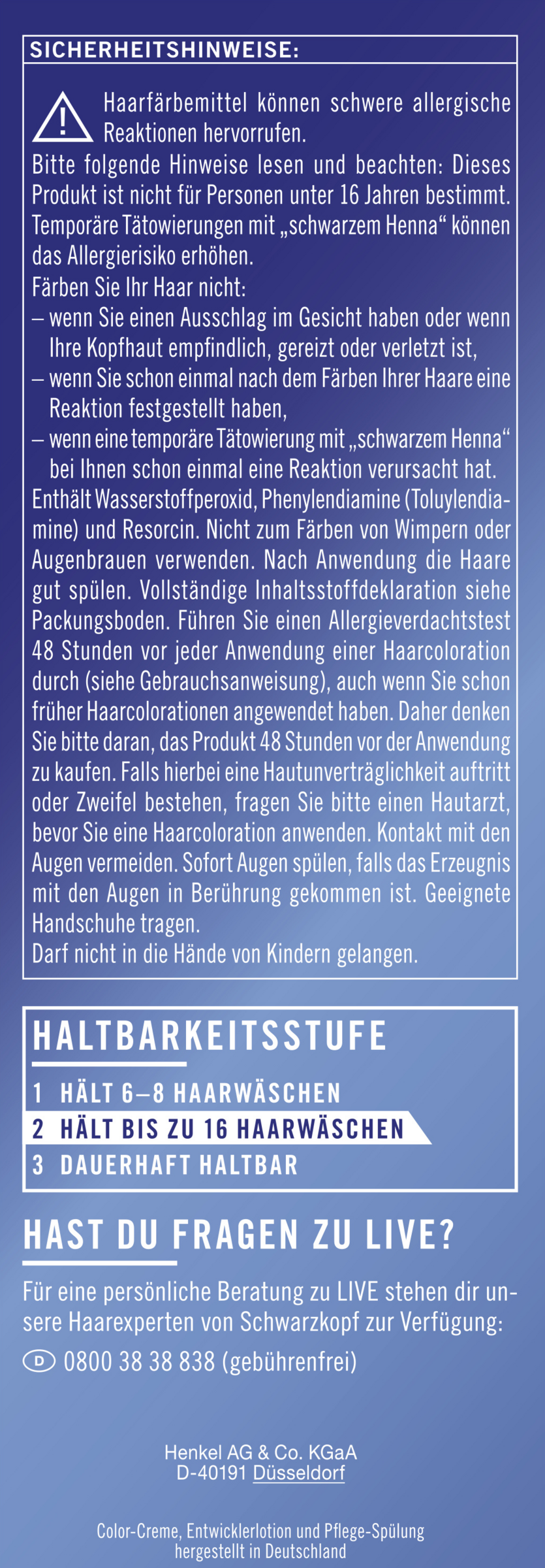Haarfärbemittel können schwere allergische Reaktionen hervorrufen. Bitte folgende Hinweise lesen und beachten: Dieses Produkt ist nicht für Personen unter 16 Jahren bestimmt. Temporäre Tätowierungen mit „schwarzem Henna“ können das Allergierisiko erhöhen. Färben Sie Ihr Haar nicht: – wenn Sie einen Ausschlag im Gesicht haben oder wenn Ihre Kopfhaut empfindlich, gereizt oder verletzt ist, – wenn Sie schon einmal nach dem Färben Ihrer Haare eine Reaktion festgestellt haben, – wenn eine temporäre Tätowierung mit „schwarzem Henna“ bei Ihnen schon einmal eine Reaktion verursacht hat. Enthält Wasserstoffperoxid, Phenylendiamine (Toluylendiamine) und Resorcin. Nicht zum Färben von Wimpern oder Augenbrauen verwenden. Nach Anwendung die Haare gut spülen. Vollständige Inhaltsstoffdeklaration siehe Packungsboden. Führen Sie einen Allergieverdachtstest 48 Stunden vor jeder Anwendung einer Haarcoloration durch (siehe Gebrauchsanweisung), auch wenn Sie schon früher Haarcolorationen angewendet haben. Daher denken Sie bitte daran, das Produkt 48 Stunden vor der Anwendung zu kaufen. Falls hierbei eine Hautunverträglichkeit auftritt oder Zweifel bestehen, fragen Sie bitte einen Hautarzt, bevor Sie eine Haarcoloration anwenden. Kontakt mit den Augen vermeiden. Sofort Augen spülen, falls das Erzeugnis mit den Augen in Berührung gekommen ist. Geeignete Handschuhe tragen.