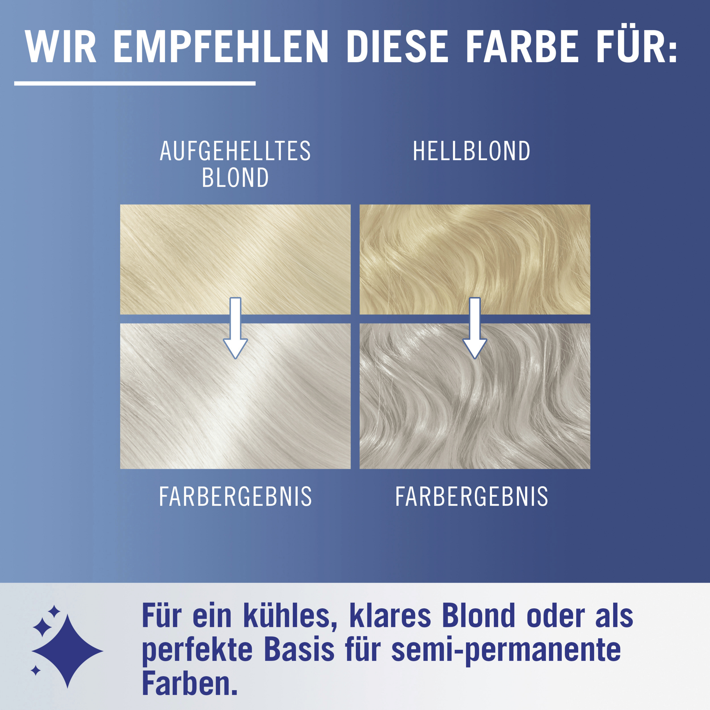 Das semi-permanente Haarfärbemittel schenkt deiner Haarfarbe einen klaren, kühlen Ton. Die Formel mit Anti-Gelbstich-Effekt neutralisiert unerwünschte Gelbtöne, für ein kühles Blond, das bis zu 16 Haarwäschen anhält.
