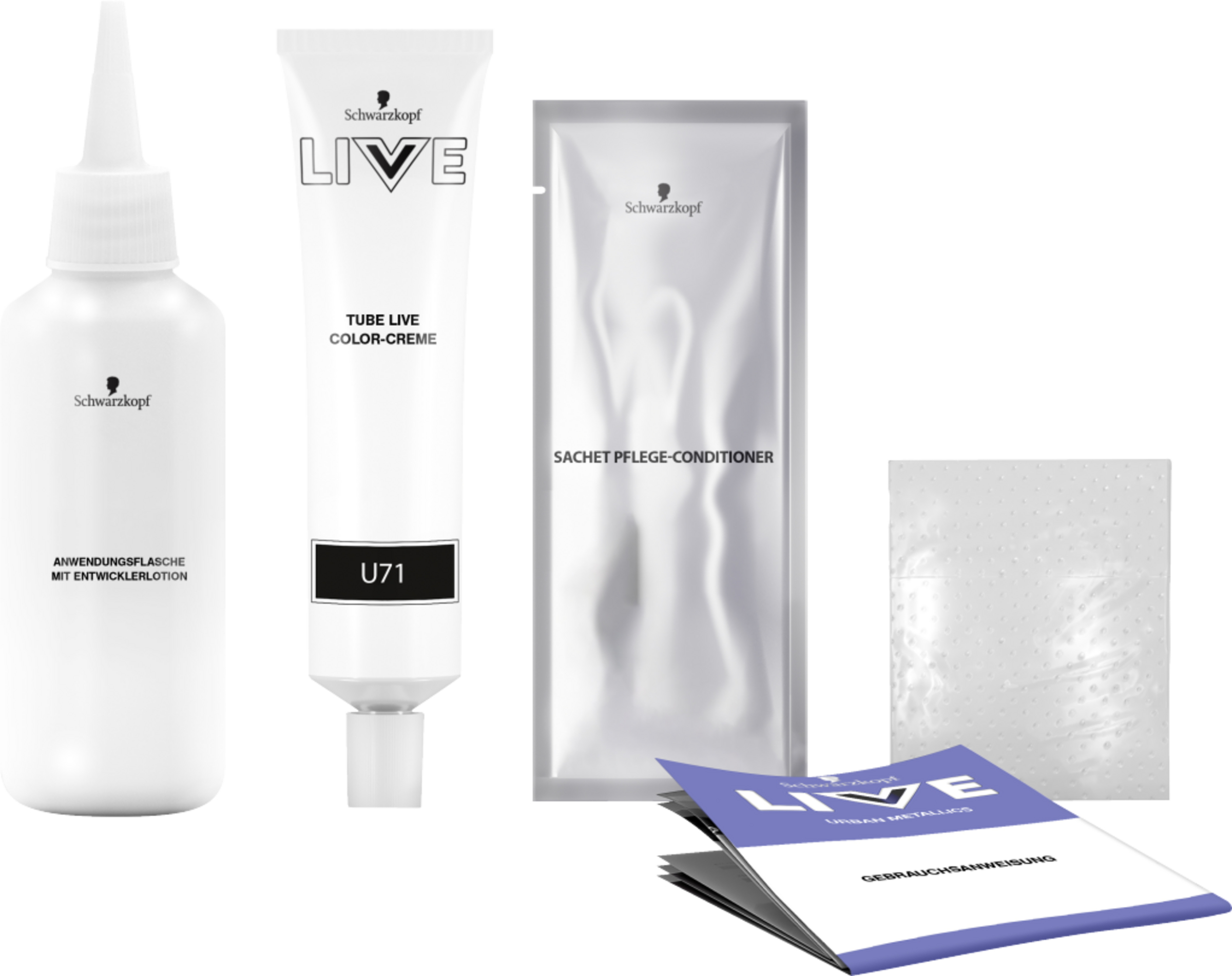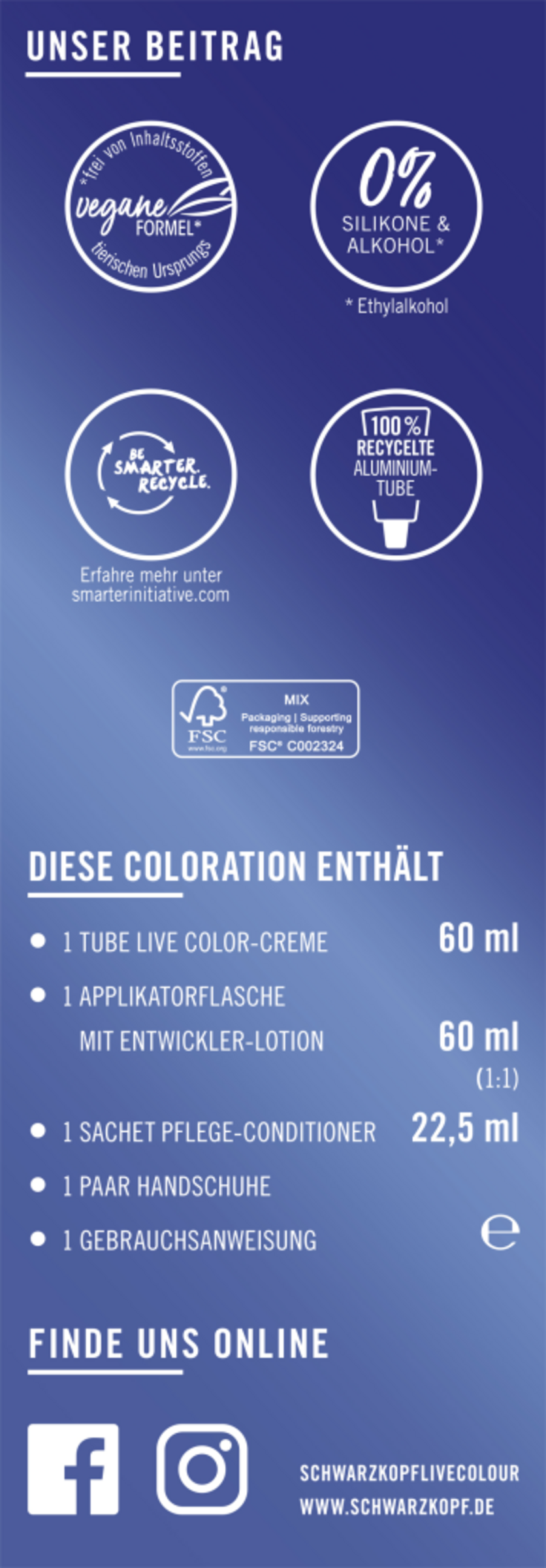 Inhalt: 1 Tube LIVE Color-Creme 60 ml 1 Applikatorflasche mit Entwickler-Lotion 60 ml 1 Sachet Pflege-Conditioner 22,5 ml 1 Paar Handschuhe 1 Gebrauchsanweisung