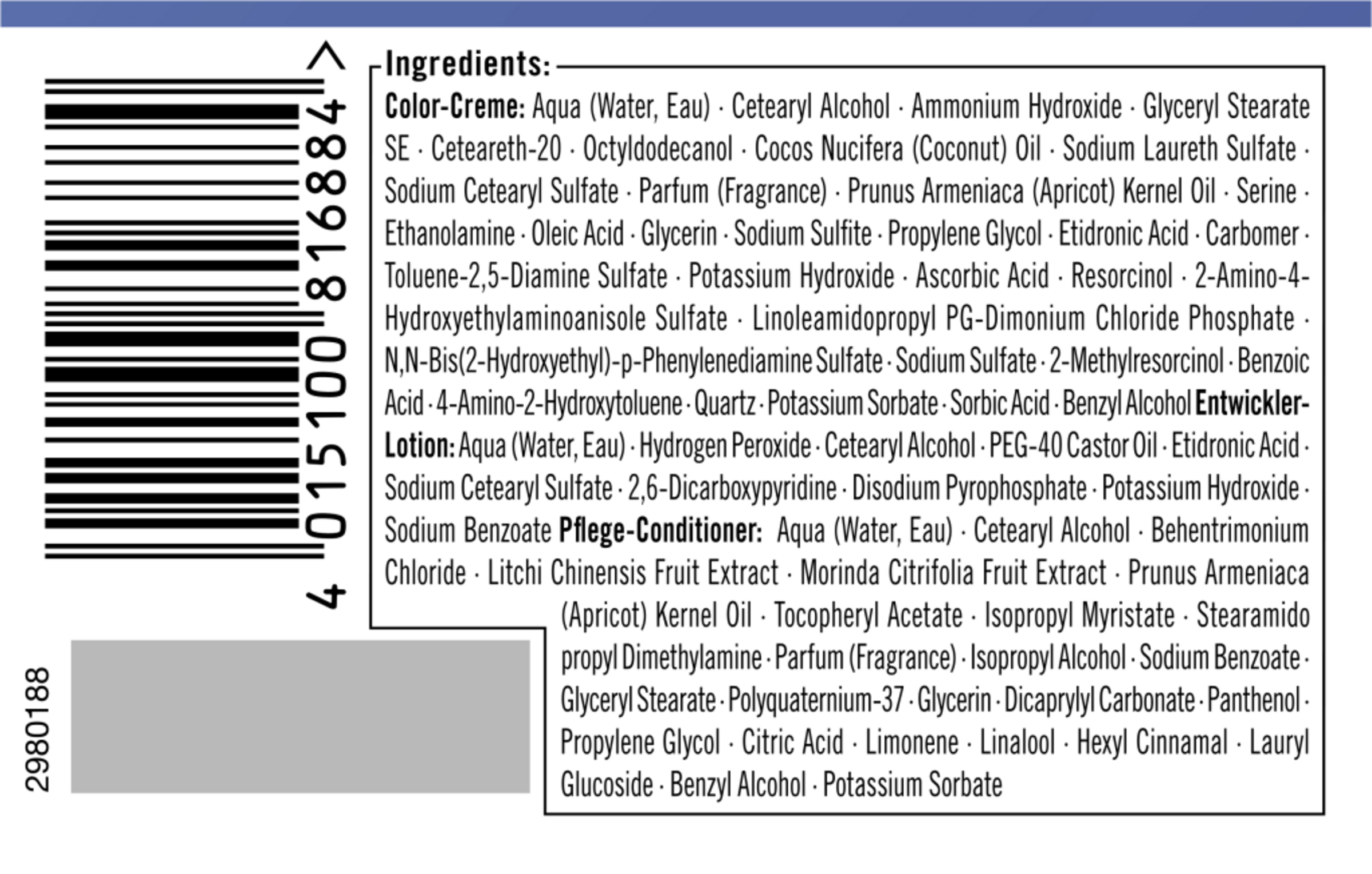 Color-Creme: Aqua (Water, Eau), Cetearyl Alcohol, Ammonium Hydroxide, Glyceryl Stearate SE, Ceteareth-20, Octyldodecanol, Cocos Nucifera (Coconut) Oil, Sodium Laureth Sulfate, Sodium Cetearyl Sulfate, Parfum (Fragrance), Prunus Armeniaca (Apricot) Kernel Oil, Serine, Ethanolamine, Oleic Acid, Glycerin, Sodium Sulfite, Propylene Glycol, Etidronic Acid, Carbomer, Toluene-2,5-Diamine Sulfate, Potassium Hydroxide, Ascorbic Acid, Resorcinol, 2-Amino-4-Hydroxyethylaminoanisole Sulfate, Linoleamidopropyl PG-Dimonium Chloride Phosphate, N,N-Bis(2-Hydroxyethyl)-p-Phenylenediamine Sulfate, Sodium Sulfate, 2-Methylresorcinol, Benzoic Acid, 4-Amino-2-Hydroxytoluene, Quartz, Potassium Sorbate, Sorbic Acid, Benzyl Alcohol
