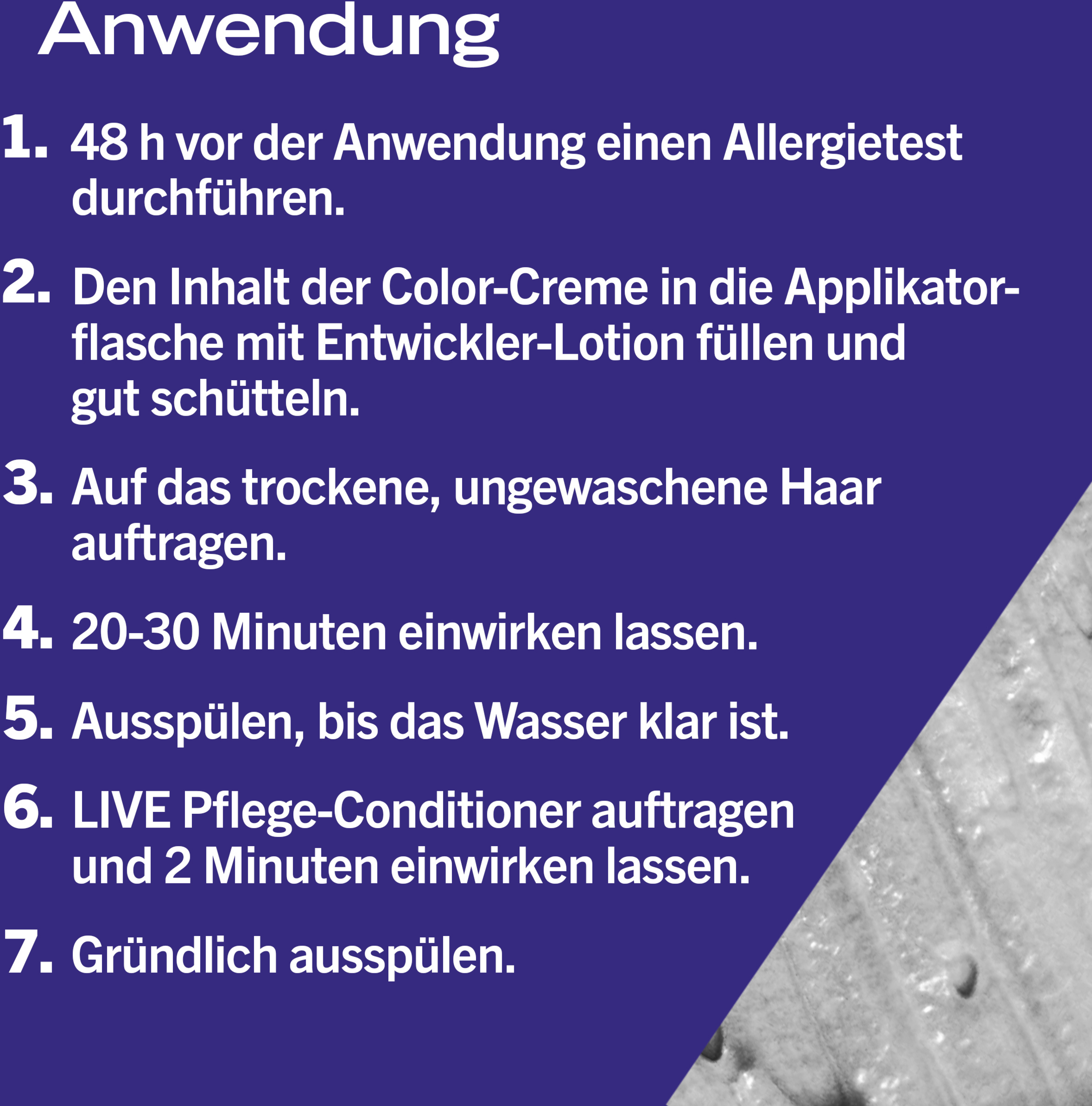 1. VORBEREITUNG Legen Sie vor Beginn der Anwendung einen Kleiderschutz und eine Uhr in die Nähe, damit Sie die Anwendungszeit überwachen können. Schwarzkopf LIVE darf nur auf trockenem, nicht vorgewaschenem Haar angewendet werden. 2. MISCHEN Schrauben Sie die Düse der Applikatorflasche mit der Entwicklerlotion ab. Stechen Sie die LIVE-Farbcremetube mit der Rückseite des Verschlusses an und drücken Sie den gesamten Inhalt vorsichtig in die Applikatorflasche mit der Entwicklerlotion. Setzen Sie die Düse des Applikators wieder auf und schütteln Sie sie kräftig, bis alle Komponenten gründlich vermischt sind und eine glatte, cremige Konsistenz aufweisen. Brechen Sie die Spitze der Applikatordüse ab und beginnen Sie sofort mit der Anwendung wie folgt. Achtung! Die Farbe der Mischung kann sich während des Färbevorgangs verändern, was jedoch keinen Einfluss auf das endgültige Farbergebnis hat. 3.a ERSTMALIGE ANWENDUNG Diese Anwendung wird empfohlen, wenn: - Sie Ihr Haar zum ersten Mal dauerhaft färben wollen - Ihre vorherige Haarfarbe vollständig herausgewachsen ist Tragen Sie die gesamte Mischung gleichmäßig, Strähne für Strähne, vom Ansatz bis zu den Spitzen Ihres Haares auf. Tragen Sie es zuerst auf die grauen Stellen auf. Massieren Sie die Mischung mit den Fingerspitzen ein, um sicherzustellen, dass alle Haare gleichmäßig bedeckt sind. Lassen Sie das Produkt 30 Minuten einwirken. 3.b ANSATZBEHANDLUNG Diese Anwendung wird empfohlen, wenn: - Ihr Haar bereits gefärbt ist und ein Ansatz sichtbar ist - die Haarspitzen dunkler oder in schlechtem Zustand sind Tragen Sie ⅔ der Mischung auf den gesamten nachwachsenden Bereich auf. Trennen Sie dazu eine Haarpartie mit dem oberen Teil der Applikator-Düse ab. Tragen Sie die Mischung mit den mitgelieferten Handschuhen entlang des Scheitels auf, indem Sie sie mit den Fingerspitzen sanft in die Wurzeln einarbeiten. Wiederholen Sie diesen Vorgang, bis der gesamte nachwachsende Bereich abgedeckt ist. Lassen Sie die Mischung 20-30 Minuten einwirken. Anschließend die restliche Mischung auf die mittleren Längen und Spitzen des Haares auftragen. Gleichmäßig einarbeiten und weitere 5-10 Minuten einwirken lassen. Die Einwirkzeit sollte insgesamt 30 Minuten betragen. 4. AUSSPÜLEN Ziehen Sie vor dem Ausspülen der Haare die Handschuhe wieder an. Am Ende der Einwirkzeit warmes Wasser auf das Haar auftragen und aufschäumen, dabei sanft am Haaransatz reiben, um Flecken zu vermeiden. Gründlich ausspülen, bis das Wasser klar ist. 5. NACHBEHANDLUNG Den Pflege-Conditioner in das handtuchtrockene Haar einarbeiten und 2 Minuten einwirken lassen. Gründlich ausspülen. Ihr Haar wird sich weich und glänzend anfühlen.