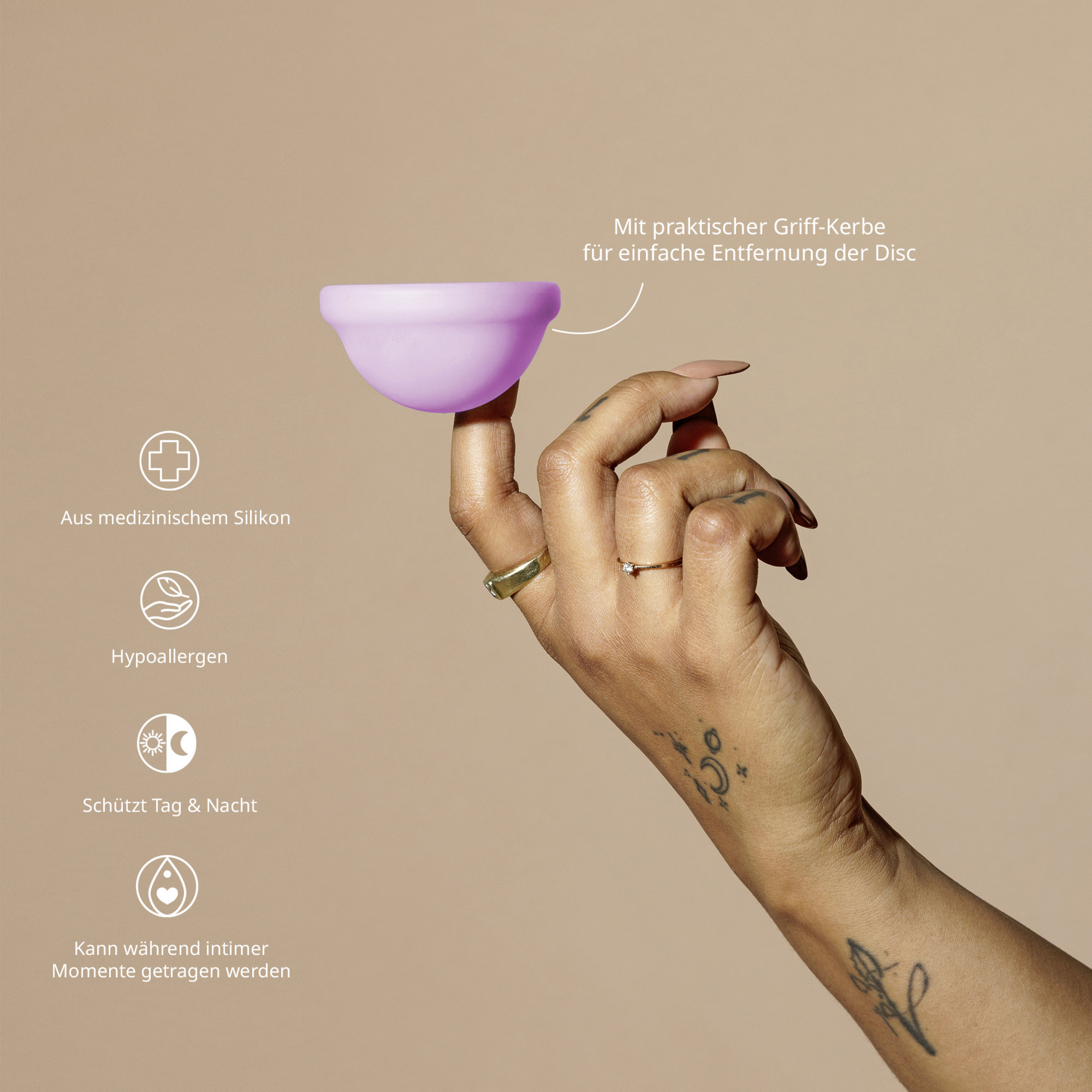 Die Menstruations-Disc besteht aus 100 % medizinischem Silikon – hypoallergen, BPA-frei, ohne Weichmacher oder Parfüm. So kannst Du sicher sein, dass sie Deine Gesundheit schützt, während Du gleichzeitig die Umwelt schonst.