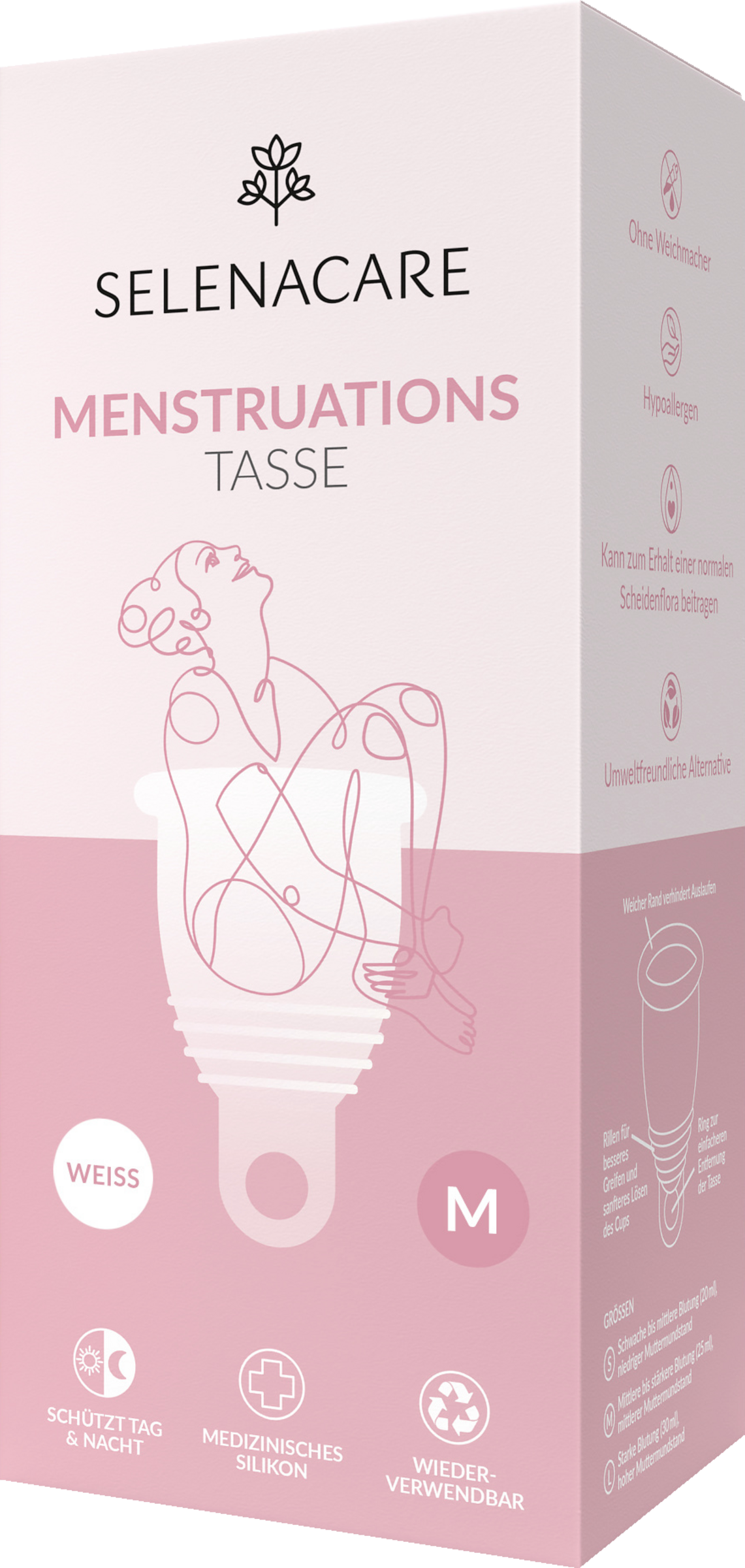 SELENACUP wird aus hochwertigstem, medizinischen Silikon hergestellt – ohne Chemikalien und Weichmacher, antiallergen, latexfrei und parfümfrei. Der SELENACUP M ist geeignet für Frauen mit mittlere bis starke Blutung, normalem Beckenboden und mittlerer Muttermundstand. SELENACUP trocknet die Scheide nicht aus, da er die Blutung nicht aufsaugt sondern auffängt. Die empfindliche Vaginal Flora bleibt so im Gleichgewicht.