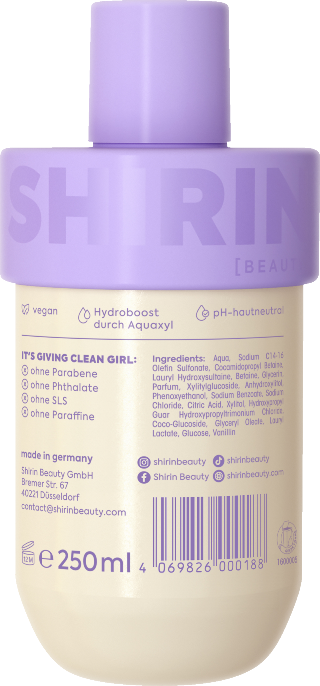Aqua, Sodium C14-16 Olefin Sulfonate, Cocamidopropyl Betaine, Lauryl Hydroxysultaine, Betaine, Glycerin, Parfum, Xylitylglucoside, Anhydroxylitol, Phenoxyethanol, Sodium Benzoate, Sodium Chloride, Citric Acid, Xylitol, Hydroxypropyl Guar Hydroxypropyltrimonium Chloride, Coco-Glucoside, Glyceryl Oleate, Lauryl Lactate, Glucose, Vanillin