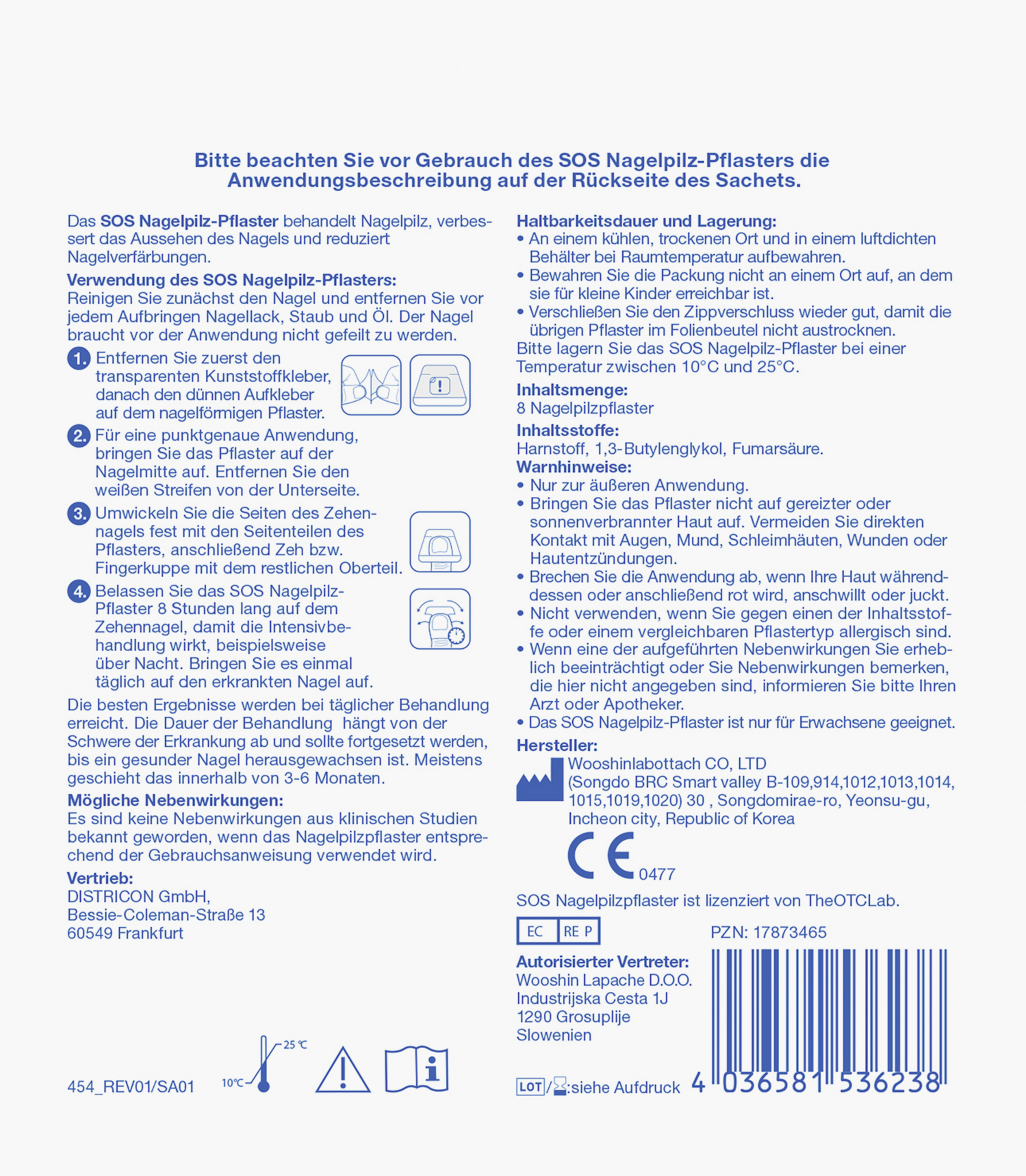 Bitte beachten Sie vor Gebrauch des Sos Nagelpilz-Pflasters die Anwendungsbeschreibung auf der Rückseite des Sachets.
