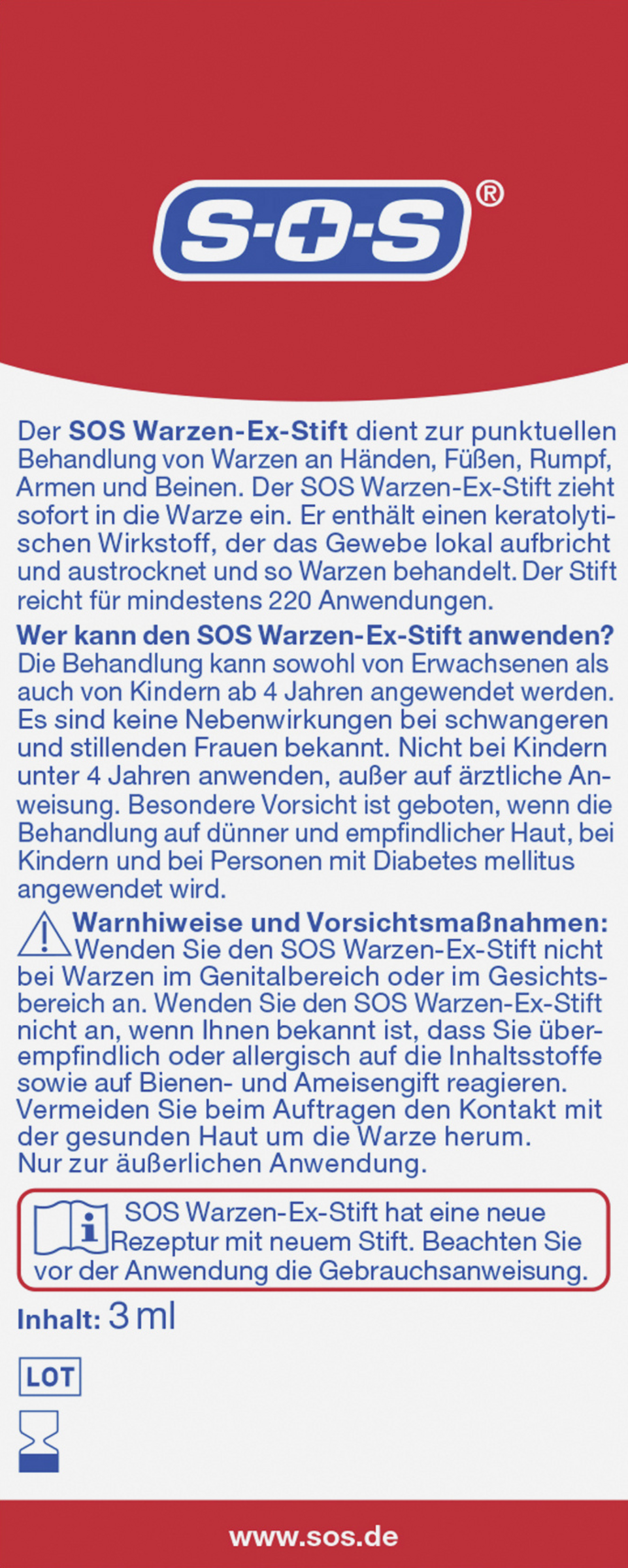 Nur für die äußere Anwendung. Das Produkt enthält einen ätzenden und stark riechenden Wirkstoff. Nicht einatmen. Wenden Sie das Produkt nicht bei Warzen im Genitalbereich oder im Gesichtsbereich an. Wenden Sie den SOS Warzen-Ex-Stift nicht an, wenn Ihnen bekannt ist, dass Sie überempfindlich oder allergisch auf die Inhaltsstoffe sowie auf Bienen- und Ameisengift reagieren. Vermeiden Sie beim Auftragen den Kontakt mit der gesunden Haut um die Warze herum. Nicht ohne ärztliche Empfehlung bei Kindern unter 4 Jahren anwenden. WENN DAS PRODUKT UNBEABSICHTIGT IN KONTAKT MIT AUGEN ODER SCHLEIMHÄUTEN GELANGT, 15 MINUTEN LANG MIT VIEL WASSER AUSSPÜLEN UND EINEN ARZT AUFSUCHEN.