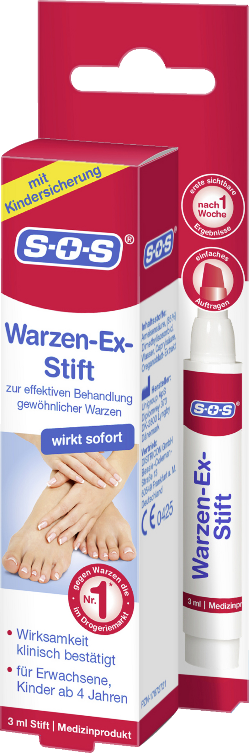 Der SOS Warzen-Ex-Stift dient zur punktuellen Behandlung von Warzen an Händen, Füßen, Rumpf, Armen und Beinen. Der SOS Warzen-Ex-Stift zieht sofort in die Warze ein. Er enthält einen keratolytischen Wirkstoff, der das Gewebe lokal aufbricht und austrocknet und so Warzen behandelt.