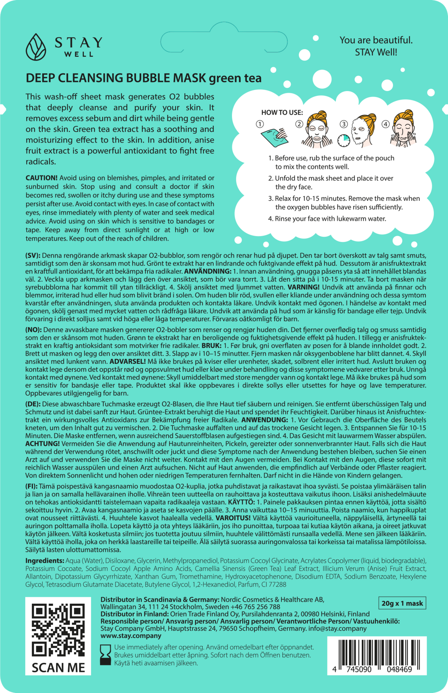 Diese abwaschbare Tuchmaske erzeugt O2-Blasen, die Ihre Haut tief säubern und reinigen. Sie entfernt überschüssigen Talg und Schmutz und ist dabei sanft zur Haut. Grüntee-Extrakt beruhigt die Haut und spendet ihr Feuchtigkeit. Darüber hinaus ist Anisfruchtextrakt ein wirkungsvolles Antioxidans zur Bekämpfung freier Radikale.