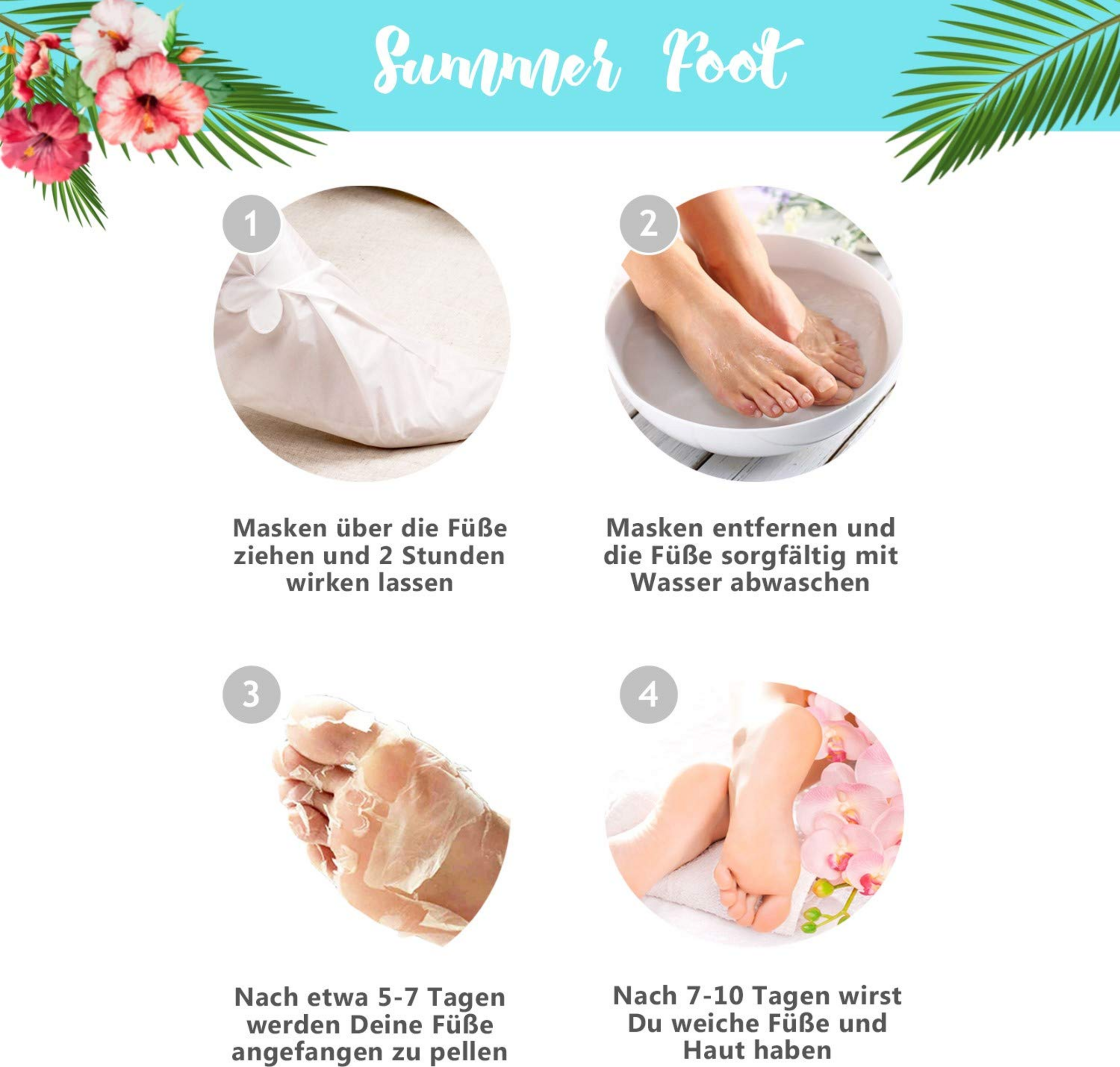 Die Fußmaske ist die perfekte Peeling Fußmaske für Sommerfüße. Die Anwendung ist denkbar einfach und schmerzfrei: Die 2 mitgelieferten Fußmasken über die Füße ziehen und 2 Stunden einwirken lassen (evtl. 2 Socken überziehen, damit die Masken enger anliegen). Danach die Füße mit Wasser abwaschen – fertig. Nach spätestens 5-7 Tagen setzt der Peeling-Effekt ein. Jegliche abgestorbene Hornhaut kann dann einfach abgezogen werden.Gönnen Sie sich entspannte Fußpflege ohne lästiges Hornhautraspeln oder Hornhauthobeln.