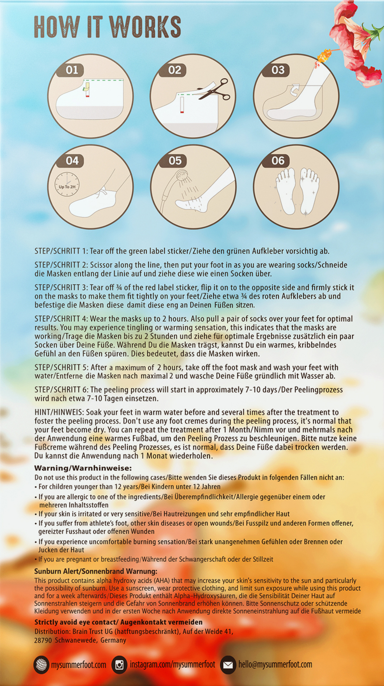 Die Summer Foot Fußmaske ist ein Premium Produkt mit hochwertigen, sorgfältig ausgewählten Inhaltsstoffen. Die Summer Foot Premium Fußmaske ermöglicht zu Hause eine einfache Fußpflege für die perfekten Summer Foot Füße.