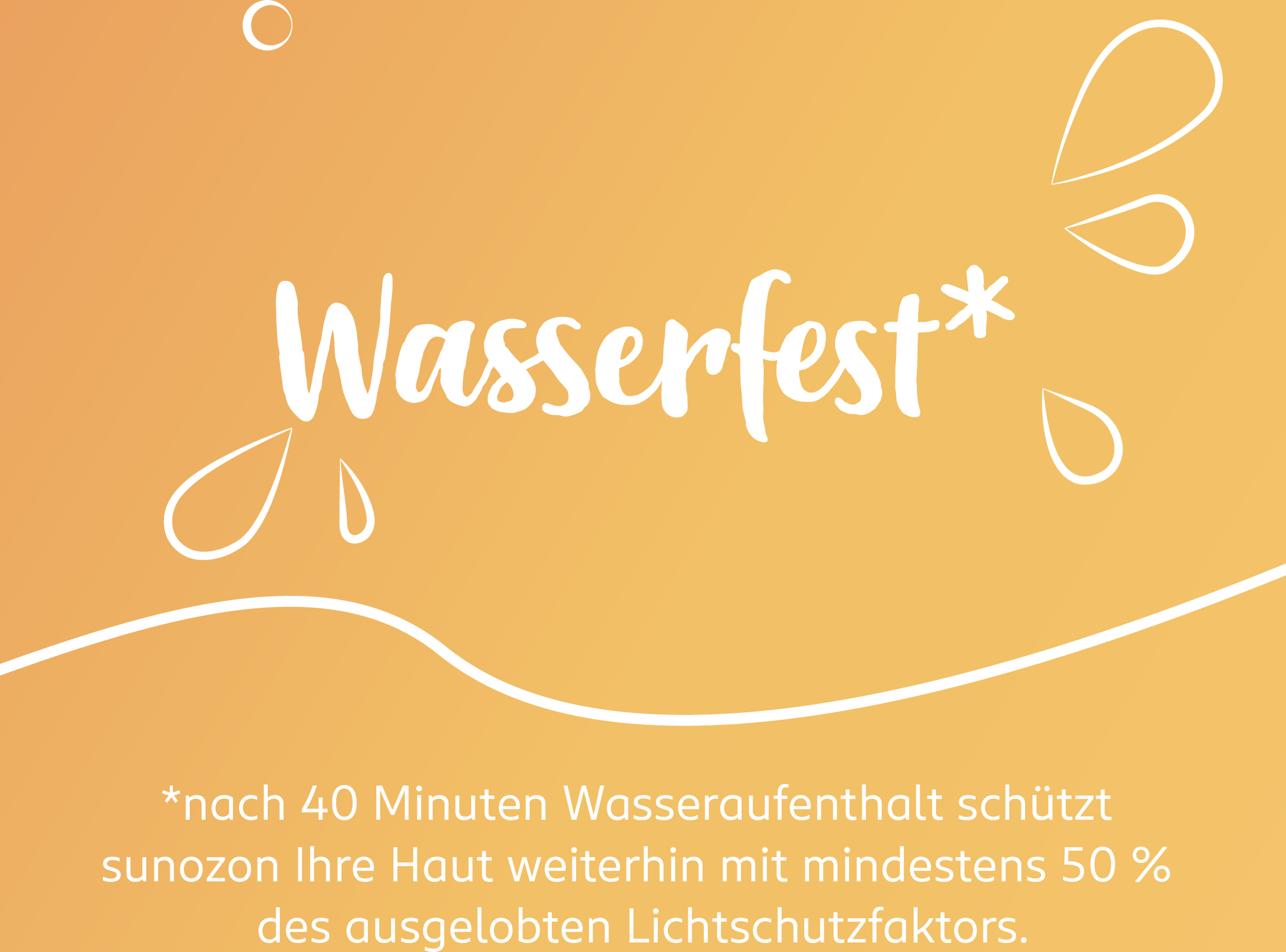 *Nach 40 Minuten Wasseraufenthalt schützt sunozon Ihre Haut weiterhin mit mindestens 50% des ausgelobten Lichtschutzfaktors.