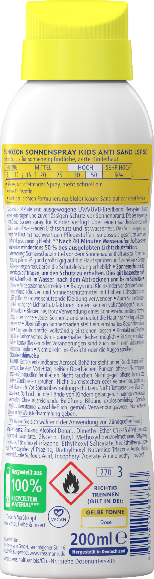 Intensive Mittagssonne vermeiden. Babys und Kleinkinder vor direkter Sonneneinstrahlung schützen und Lichtschutz mit hohem Lichtschutzfaktor (LSF größer 25) sowie schützende Kleidung verwenden. Auch Sonnenschutzmittel mit hohem Lichtschutz bieten keinen vollständigen Schutz vor UV – Strahlen. Bleiben Sie, trotz Verwendung eines Sonnenschutzmittels, nicht zu lange in der Sonne. Jeder Sonnenbrand schädigt die Haut nachhaltig und ist zu vermeiden. Übermäßiges Sonnenbaden stellt ein ernsthaftes Gesundheitsrisiko dar. Sonnenschutzmittel vollständig einziehen lassen. Kontakt mit Textilien und Oberflächen vermeiden – dauerhafte Flecken möglich. Bildung von dauerhaften Kontaktflecken oder Veränderungen sind auch nach dem vollständigen Einziehen möglich. Nicht direkt ins Gesicht oder die Augen sprühen.
