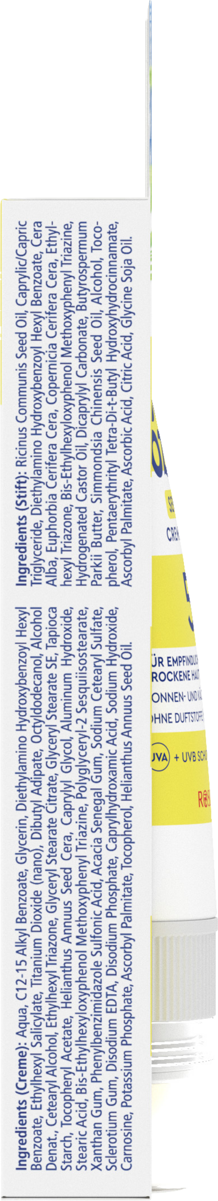 Creme: Aqua, C12-15 Alkyl Benzoate, Glycerin, Diethylamino Hydroxybenzoyl Hexyl Benzoate, Ethylhexyl Salicylate, Titanium Dioxide (nano), Dibutyl Adipate, Octyldodecanol, Alcohol Denat., Cetearyl Alcohol, Ethylhexyl Triazone, Glyceryl Stearate Citrate, Glyceryl Stearate SE, Tapioca Starch, Tocopheryl Acetate, Helianthus Annuus Seed Cera, Caprylyl Glycol, Aluminum Hydroxide, Stearic Acid, Bis-Ethylhexyloxyphenol Methoxyphenyl Triazine, Polyglyceryl-2 Sesquiisostearate, Xanthan Gum, Phenylbenzimidazole Sulfonic Acid, Acacia Senegal Gum, Sodium Cetearyl Sulfate, Sclerotium Gum, Disodium EDTA, Disodium Phosphate, Caprylhydroxamic Acid, Sodium Hydroxide, Carnosine, Potassium Phosphate, Ascorbyl Palmitate, Tocopherol, Helianthus Annuus Seed Oil. Stift: Ricinus Communis Seed Oil, Caprylic/Capric Triglyceride, Diethylamino Hydroxybenzoyl Hexyl Benzoate, Cera Alba, Euphorbia Cerifera Cera, Copernicia Cerifera Cera, Ethylhexyl Triazone, Bis-Ethylhexyloxyphenol Methoxyphenyl Triazine, Hydrogenated Castor Oil, Dicaprylyl Carbonate, Butyrospermum Parkii Butter, Simmondsia Chinensis Seed Oil, Alcohol, Tocopherol, Pentaerythrityl Tetra-Di-t-Butyl Hydroxyhydrocinnamate, Ascorbyl Palmitate, Ascorbic Acid, Citric Acid, Glycine Soja Oil.