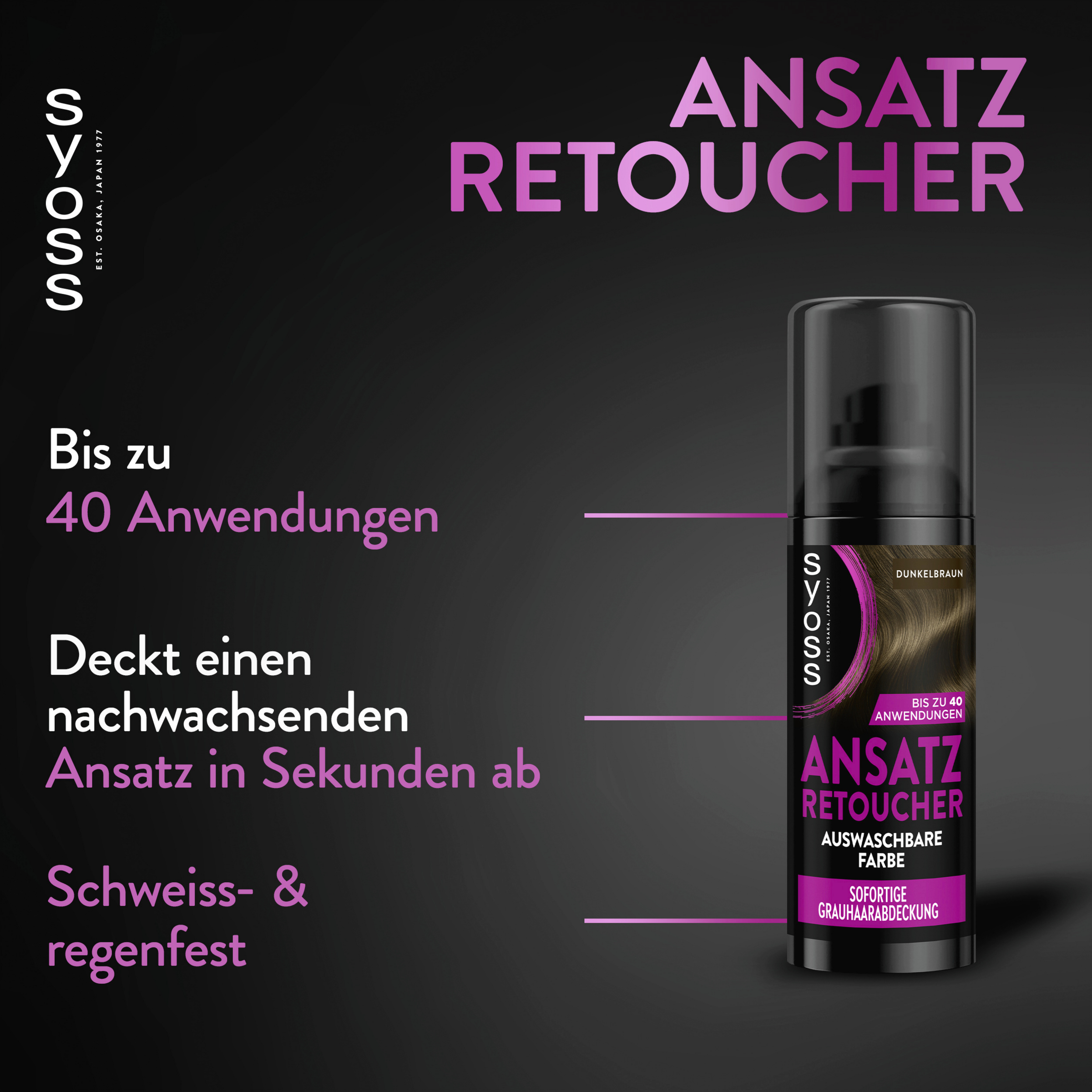 Das Ansatz Retoucher Kaschierspray von SYOSS deckt dank mikrofeiner kosmetischer Farbpigmente einen helleren und grau nachwachsenden Ansatz in wenigen Sekunden ab. Sofort trocknend, hinterlässt der Retoucher ein gleichmäßiges Farbergebnis und passt sich harmonisch den Haarlängen an. Der präzise Spray-Applikator verteilt die Farbpigmente nur auf den gewünschten Stellen. Das Ergebnis hält bis zur nächsten Haarwäsche und ist so einfach zu nutzen wie das tägliche Make-up.