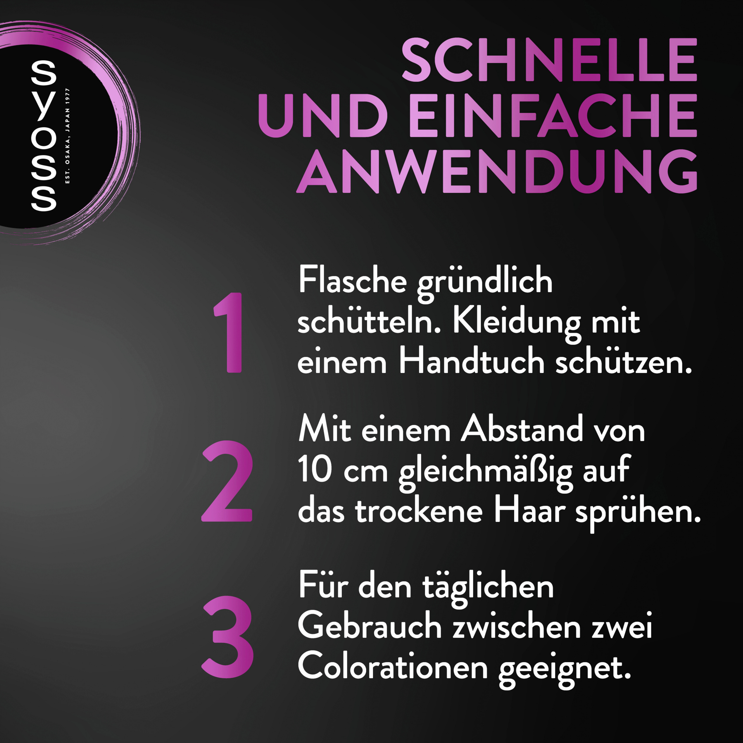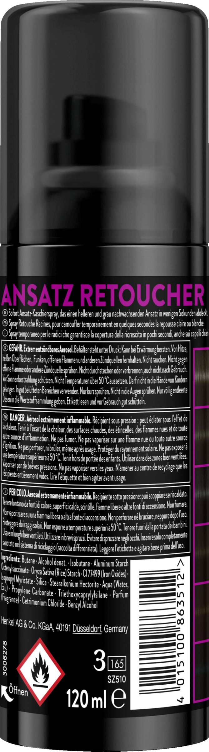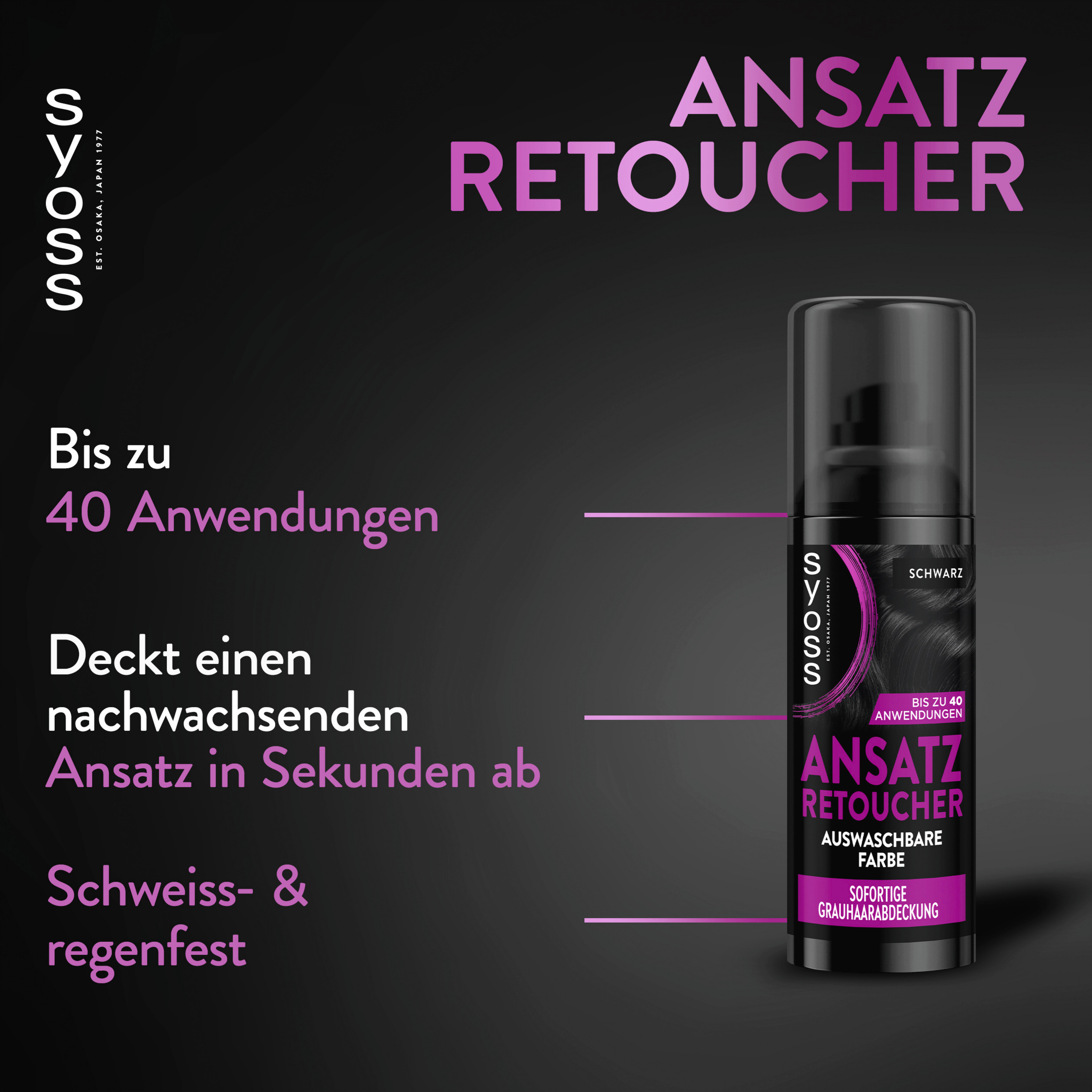 Das Ansatz Retoucher Kaschierspray von SYOSS deckt dank mikrofeiner kosmetischer Farbpigmente einen helleren und grau nachwachsenden Ansatz in wenigen Sekunden ab. Sofort trocknend, hinterlässt der Retoucher ein gleichmäßiges Farbergebnis und passt sich harmonisch den Haarlängen an. Der präzise Spray-Applikator verteilt die Farbpigmente nur auf den gewünschten Stellen. Das Ergebnis hält bis zur nächsten Haarwäsche und ist so einfach zu nutzen wie das tägliche Make-up.