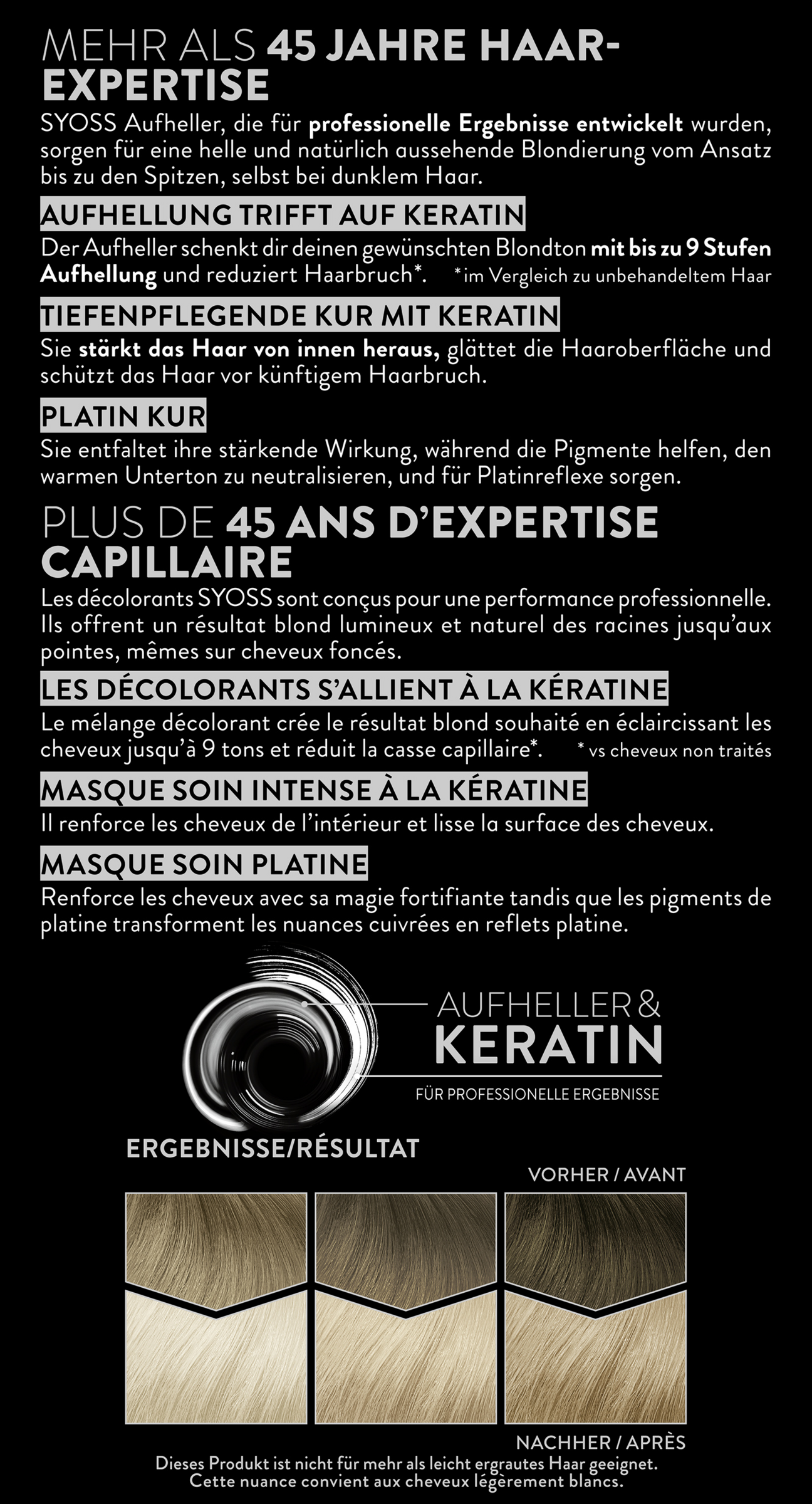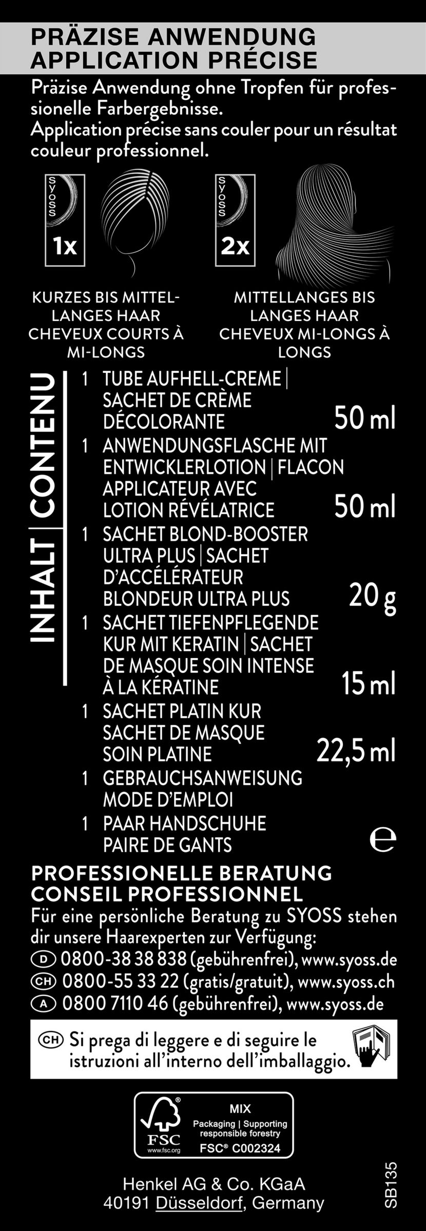 ACHTUNG, BITTE VOR DER ANWENDUNG BEACHTEN, bitte lies die Sicherheitshinweise auf der Rückseite der Gebrauchsanweisung sorgfältig durch. Lege vor Beginn der Anwendung ein Handtuch und eine Uhr in die Nähe, um die Einwirkzeit zu überwachen. SYOSS PLATIN AUFHELLER dürfen nur auf trockenem, nicht vorgewaschenem Haar angewendet werden.