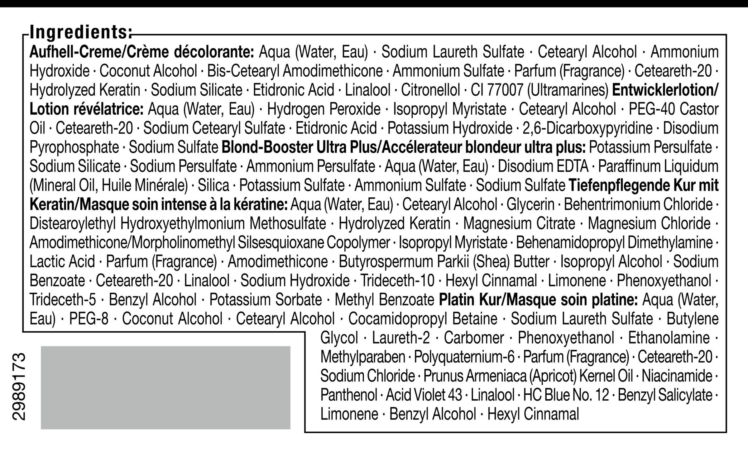 Blond-Booster Ultra Plus/ Accélerateur blondeur ultra plus: Potassium Persulfate, Sodium Silicate, Sodium Persulfate, Ammonium Persulfate, Aqua (Water, Eau), Disodium EDTA, Paraffinum Liquidum (Mineral Oil, Huile Minérale), Silica, Potassium Sulfate, Ammonium Sulfate, Sodium Sulfate|Tiefpflegende Kur mit Keratin/Masque soin intense à la kératine: Aqua (Water, Eau), Cetearyl Alcohol, Glycerin, Behentrimonium Chloride, Distearoylethyl Hydroxyethylmonium Methosulfate, Hydrolyzed Keratin, Magnesium Citrate, Magnesium Chloride, Amodimethicone/Morpholinomethyl Silsesquioxane Copolymer, Isopropyl Myristate, Behenamidopropyl Dimethylamine, Lactic Acid, Parfum (Fragrance), Amodimethicone, Butyrospermum Parkii (Shea) Butter, Isopropyl Alcohol, Sodium Benzoate, Ceteareth-20, Linalool, Sodium Hydroxide, Trideceth-10, Hexyl Cinnamal, Limonene, Phenoxyethanol, Trideceth-5, Benzyl Alcohol, Potassium Sorbate, Methyl Benzoate