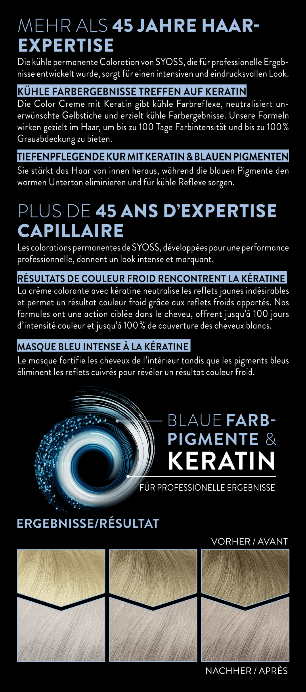 Die kühle permanente Coloration von Syoss, die für professionelle Ergebnisse entwickelt wurde, sorgt für einen intensiven Look, bis zu 100 Tage Farbintensität und 100 % Grauabdeckung. Für ein besonders strahlendes Farbergebnis sind sowohl die dauerhafte Haarfarbe, als auch die beiliegende Haarkur, mit Keratin angereichert, welches das Haar von innen heraus stärkt. Die tiefenpflegende Kur eliminiert dank blauer Pigmente unerwünschte Gelbstiche im Haar und schenkt kühle Farbreflexe.