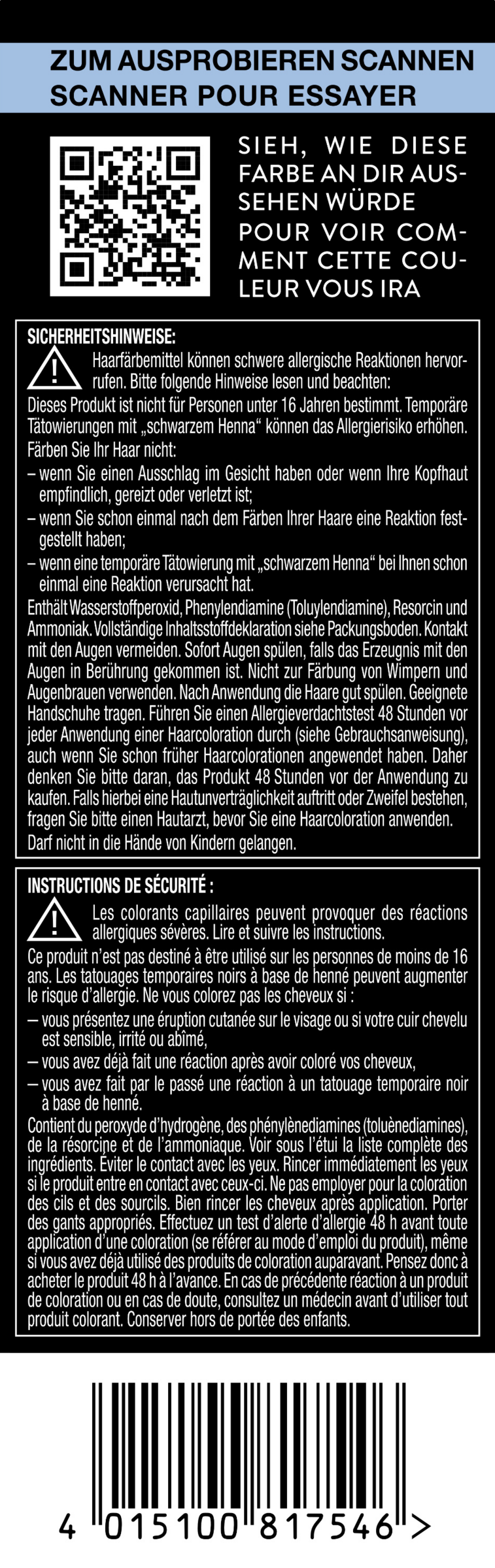 Haarfärbemittel können schwere allergische Reaktionen hervorrufen. Bitte folgende Hinweise lesen und beachten: Dieses Produkt ist nicht für Personen unter 16 Jahren bestimmt. Temporäre Tätowierungen mit "schwarzem Henna" können das Allergierisiko erhöhen. Färben Sie Ihr Haar nicht: - wenn Sie einen Ausschlag im Gesicht haben oder wenn Ihre Kopfhaut empfindlich, gereizt oder verletzt ist; - wenn Sie schon einmal nach dem Färben Ihrer Haare eine Reaktion festgestellt haben; - wenn eine temporäre Tätowierung mit "schwarzem Henna" bei Ihnen schon einmal eine Reaktion verursacht hat. Enthält Wasserstoffperoxid, Phenylendiamine (Toluylendiamine), Resorcin und Ammoniak. Vollständige Inhaltsstoffdeklaration siehe Packungsboden. Kontakt mit den Augen vermeiden. Sofort Augen spülen, falls das Erzeugnis mit den Augen in Berührung gekommen ist. Nicht zur Färbung von Wimpern und Augenbrauen verwenden. Nach Anwendung die Haare gut spülen. Geeignete Handschuhe tragen. Führen Sie einen Allergieverdachtstest 48 Stunden vor jeder Anwendung einer Haarcoloration durch (siehe Gebrauchsanweisung), auch wenn Sie schon früher Haarcolorationen angewendet haben. Daher denken Sie bitte daran, das Produkt 48 Stunden vor der Anwendung zu kaufen. Falls hierbei eine Hautunverträglichkeit auftritt oder Zweifel bestehen, fragen Sie bitte einen Hautarzt, bevor Sie eine Haarcoloration anwenden. Darf nicht in die Hände von Kindern gelangen.