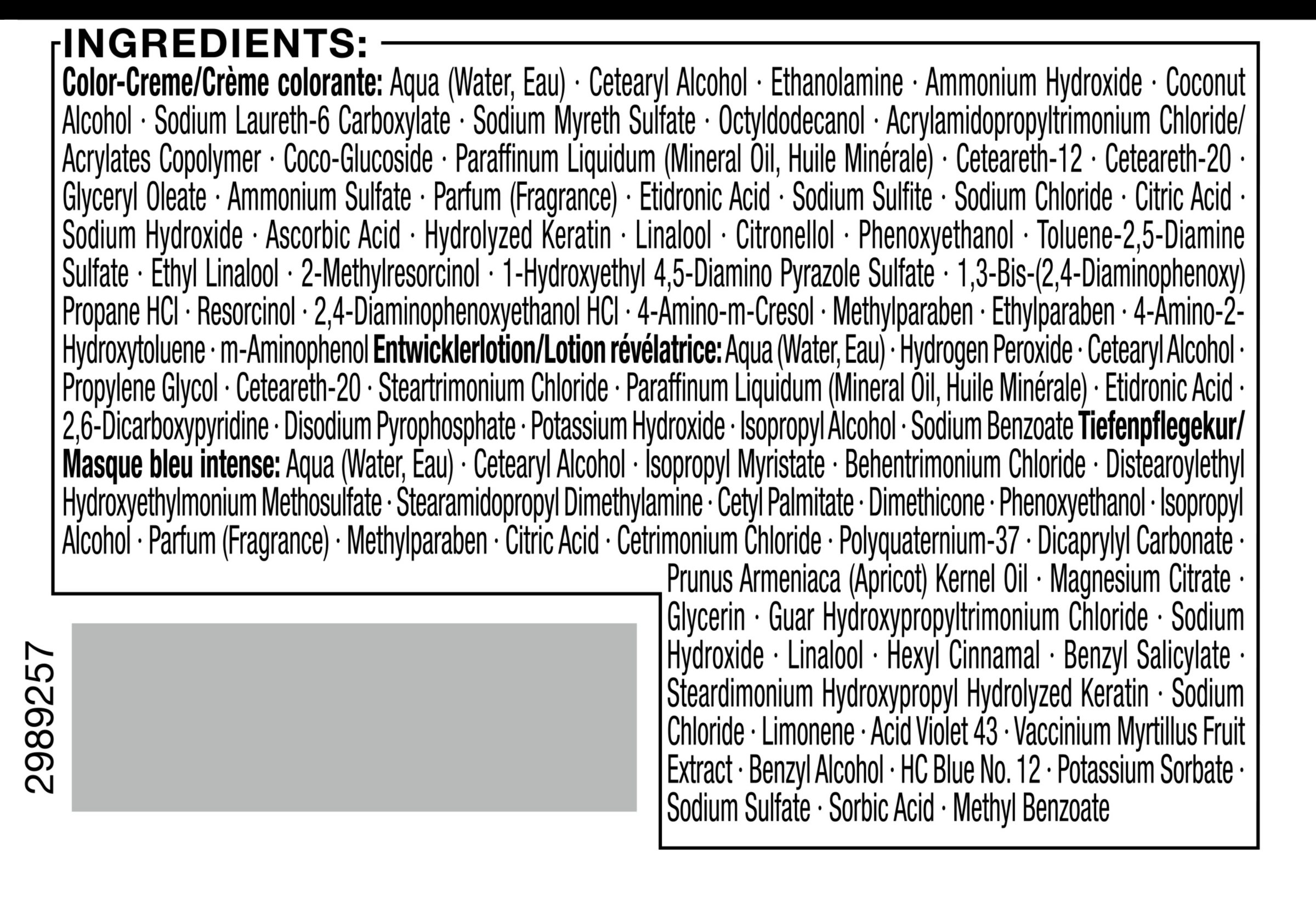 Color-Creme/Crème colorante: Aqua (Water, Eau), Cetearyl Alcohol, Ethanolamine, Ammonium Hydroxide, Coconut Alcohol, Sodium Laureth-6 Carboxylate, Sodium Myreth Sulfate, Octyldodecanol, Acrylamidopropyltrimonium Chloride/Acrylates Copolymer, Coco-Glucoside, Paraffinum Liquidum (Mineral Oil, Huile Minérale), Ceteareth-12, Ceteareth-20, Glyceryl Oleate, Ammonium Sulfate, Parfum (Fragrance), Etidronic Acid, Sodium Sulfite, Sodium Chloride, Citric Acid, Sodium Hydroxide, Ascorbic Acid, Hydrolyzed Keratin, Linalool, Citronellol, Phenoxyethanol, Toluene-2,5-Diamine Sulfate, Ethyl Linalool, 2-Methylresorcinol, 1-Hydroxyethyl 4,5-Diamino Pyrazole Sulfate, 1,3-Bis-(2,4-Diaminophenoxy) Propane HCl, Resorcinol, 2,4-Diaminophenoxyethanol HCl, 4-Amino-m-Cresol, Methylparaben, Ethylparaben, 4-Amino-2-Hydroxytoluene, m-Aminophenol