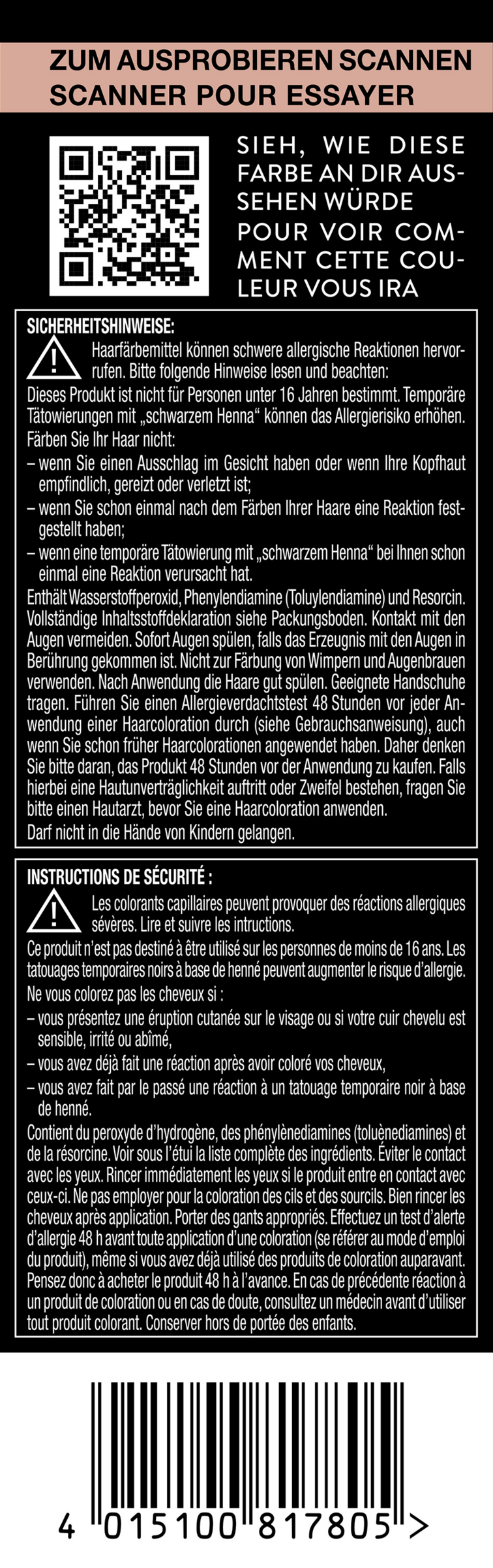 Haarfärbemittel können schwere allergische Reaktionen hervorrufen. Bitte folgende Hinweise lesen und beachten: Dieses Produkt ist nicht für Personen unter 16 Jahren bestimmt. Temporäre Tätowierungen mit "schwarzem Henna" können das Allergierisiko erhöhen. Färben Sie Ihr Haar nicht: - wenn Sie einen Ausschlag im Gesicht haben oder wenn Ihre Kopfhaut empfindlich, gereizt oder verletzt ist; - wenn Sie schon einmal nach dem Färben Ihrer Haare eine Reaktion festgestellt haben; - wenn eine temporäre Tätowierung mit "schwarzem Henna" bei Ihnen schon einmal eine Reaktion verursacht hat. Enthält Wasserstoffperoxid, Phenylendiamine (Toluylendiamine) und Resorcin. Vollständige Inhaltsstoffdeklaration siehe Packungsboden. Kontakt mit den Augen vermeiden. Sofort Augen spülen, falls das Erzeugnis mit den Augen in Berührung gekommen ist. Nicht zur Färbung von Wimpern und Augenbrauen verwenden. Nach Anwendung die Haare gut spülen. Geeignete Handschuhe tragen. Führen Sie einen Allergieverdachtstest 48 Stunden vor jeder Anwendung einer Haarcoloration durch (siehe Gebrauchsanweisung), auch wenn Sie schon früher Haarcolorationen angewendet haben. Daher denken Sie bitte daran, das Produkt 48 Stunden vor der Anwendung zu kaufen. Falls hierbei eine Hautunverträglichkeit auftritt oder Zweifel bestehen, fragen Sie bitte einen Hautarzt, bevor Sie eine Haarcoloration anwenden. Darf nicht in die Hände von Kindern gelangen.
