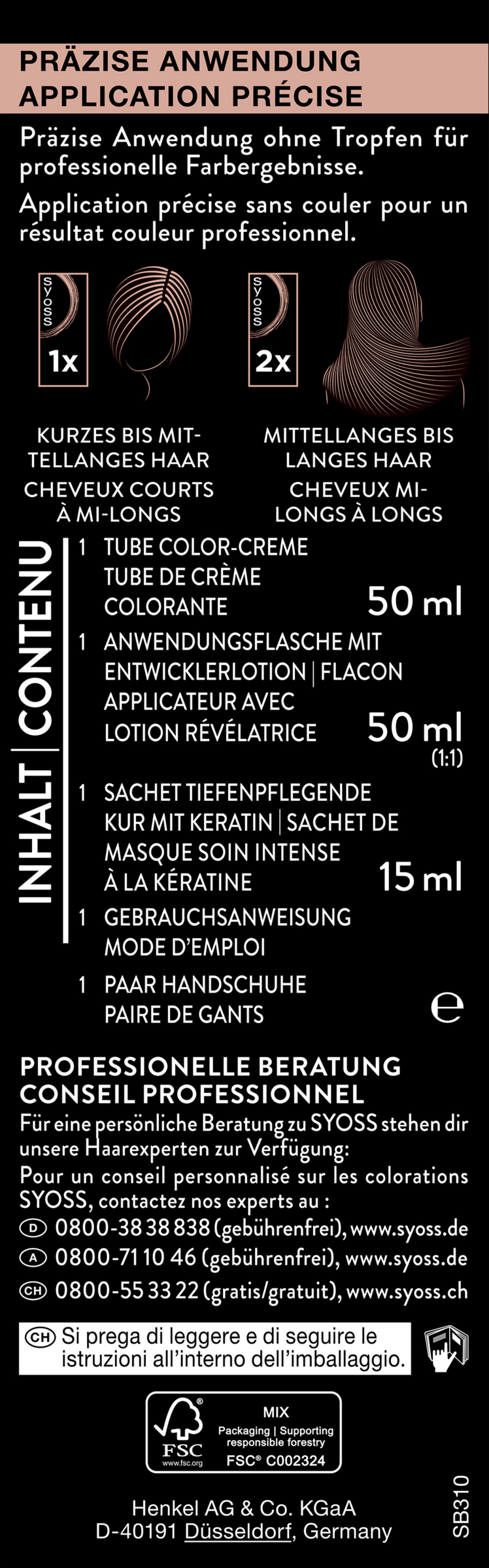 Die permanente Coloration von Syoss, die für professionelle Ergebnisse entwickelt wurde, sorgt für einen intensiven Look, bis zu 100 Tage Farbintensität und 100 % Grauabdeckung. Für ein besonders strahlendes Farbergebnis sind sowohl die dauerhafte Haarfarbe, als auch die beiliegende Haarkur, mit Keratin angereichert, welches das Haar von innen heraus stärkt und die Haaroberfläche glättet. Dadurch werden die Farbpigmente eingeschlossen und kommen so besonders lebendig zur Geltung.