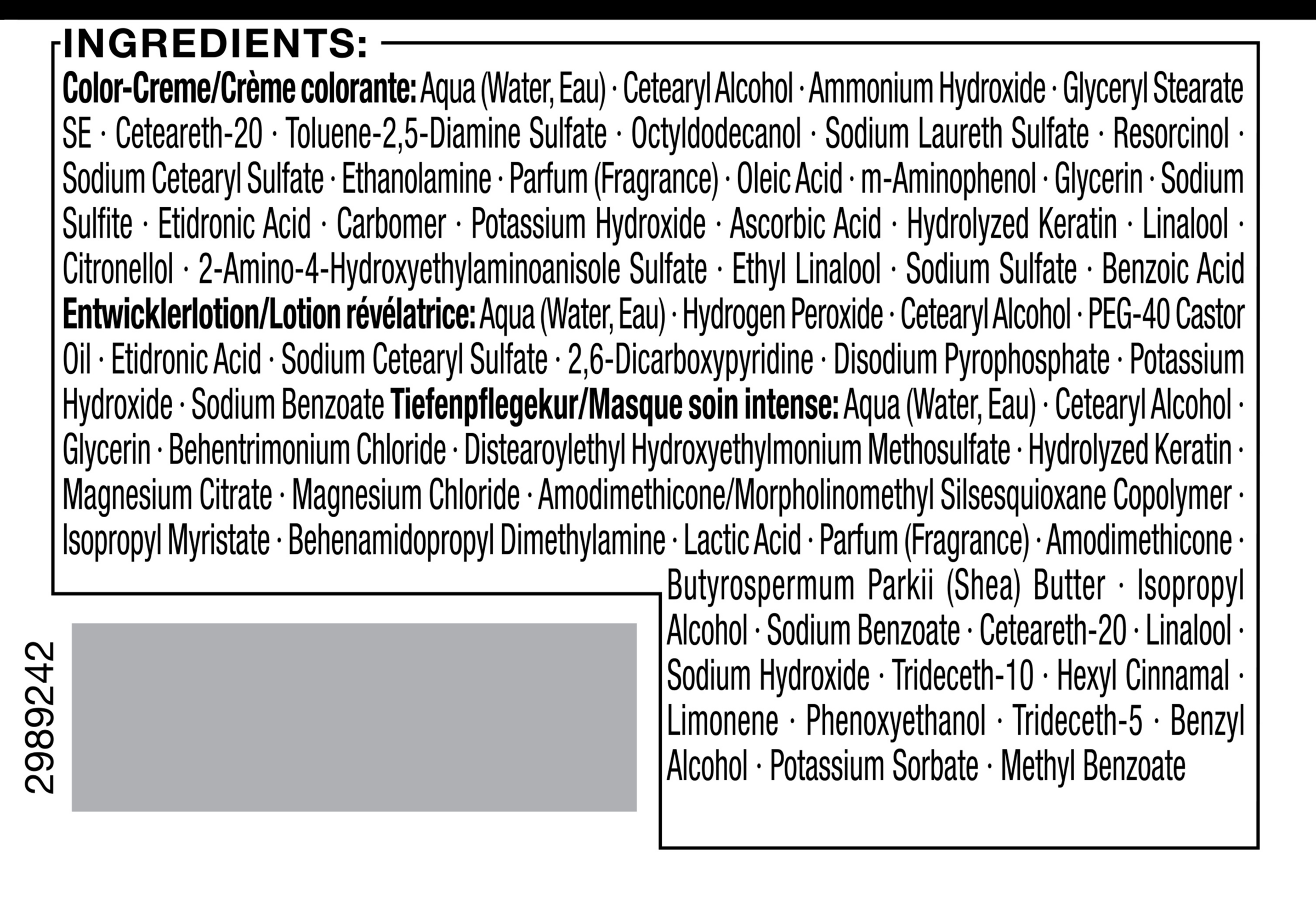 Color-Creme/Crème colorante: Aqua (Water, Eau), Cetearyl Alcohol, Ammonium Hydroxide, Glyceryl Stearate SE, Ceteareth-20, Toluene-2,5-Diamine Sulfate, Octyldodecanol, Sodium Laureth Sulfate, Resorcinol, Sodium Cetearyl Sulfate, Ethanolamine, Parfum (Fragrance), Oleic Acid, m-Aminophenol, Glycerin, Sodium Sulfite, Etidronic Acid, Carbomer, Potassium Hydroxide, Ascorbic Acid, Hydrolyzed Keratin, Linalool, Citronellol, 2-Amino-4-Hydroxyethylaminoanisole Sulfate, Ethyl Linalool, Sodium Sulfate, Benzoic Acid