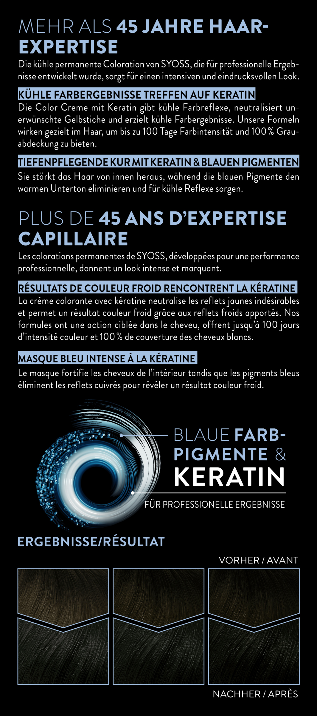 Die kühle permanente Coloration von Syoss, die für professionelle Ergebnisse entwickelt wurde, sorgt für einen intensiven Look, bis zu 100 Tage Farbintensität und 100 % Grauabdeckung. Für ein besonders strahlendes Farbergebnis sind sowohl die dauerhafte Haarfarbe, als auch die beiliegende Haarkur, mit Keratin angereichert, welches das Haar von innen heraus stärkt. Die tiefenpflegende Kur eliminiert dank blauer Pigmente unerwünschte Gelbstiche im Haar und schenkt kühle Farbreflexe.