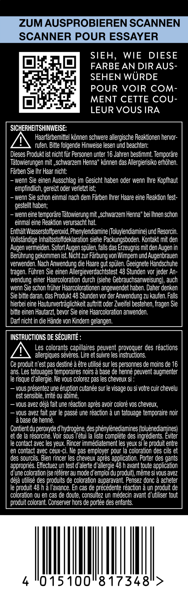 Haarfärbemittel können schwere allergische Reaktionen hervorrufen. Bitte folgende Hinweise lesen und beachten: Dieses Produkt ist nicht für Personen unter 16 Jahren bestimmt. Temporäre Tätowierungen mit "schwarzem Henna" können das Allergierisiko erhöhen. Färben Sie Ihr Haar nicht: - wenn Sie einen Ausschlag im Gesicht haben oder wenn Ihre Kopfhaut empfindlich, gereizt oder verletzt ist; - wenn Sie schon einmal nach dem Färben Ihrer Haare eine Reaktion festgestellt haben; - wenn eine temporäre Tätowierung mit "schwarzem Henna" bei Ihnen schon einmal eine Reaktion verursacht hat. Enthält Wasserstoffperoxid, Phenylendiamine (Toluylendiamine) und Resorcin. Vollständige Inhaltsstoffdeklaration siehe Packungsboden. Kontakt mit den Augen vermeiden. Sofort Augen spülen, falls das Erzeugnis mit den Augen in Berührung gekommen ist. Nicht zur Färbung von Wimpern und Augenbrauen verwenden. Nach Anwendung die Haare gut spülen. Geeignete Handschuhe tragen. Führen Sie einen Allergieverdachtstest 48 Stunden vor jeder Anwendung einer Haarcoloration durch (siehe Gebrauchsanweisung), auch wenn Sie schon früher Haarcolorationen angewendet haben. Daher denken Sie bitte daran, das Produkt 48 Stunden vor der Anwendung zu kaufen. Falls hierbei eine Hautunverträglichkeit auftritt oder Zweifel bestehen, fragen Sie bitte einen Hautarzt, bevor Sie eine Haarcoloration anwenden. Darf nicht in die Hände von Kindern gelangen.