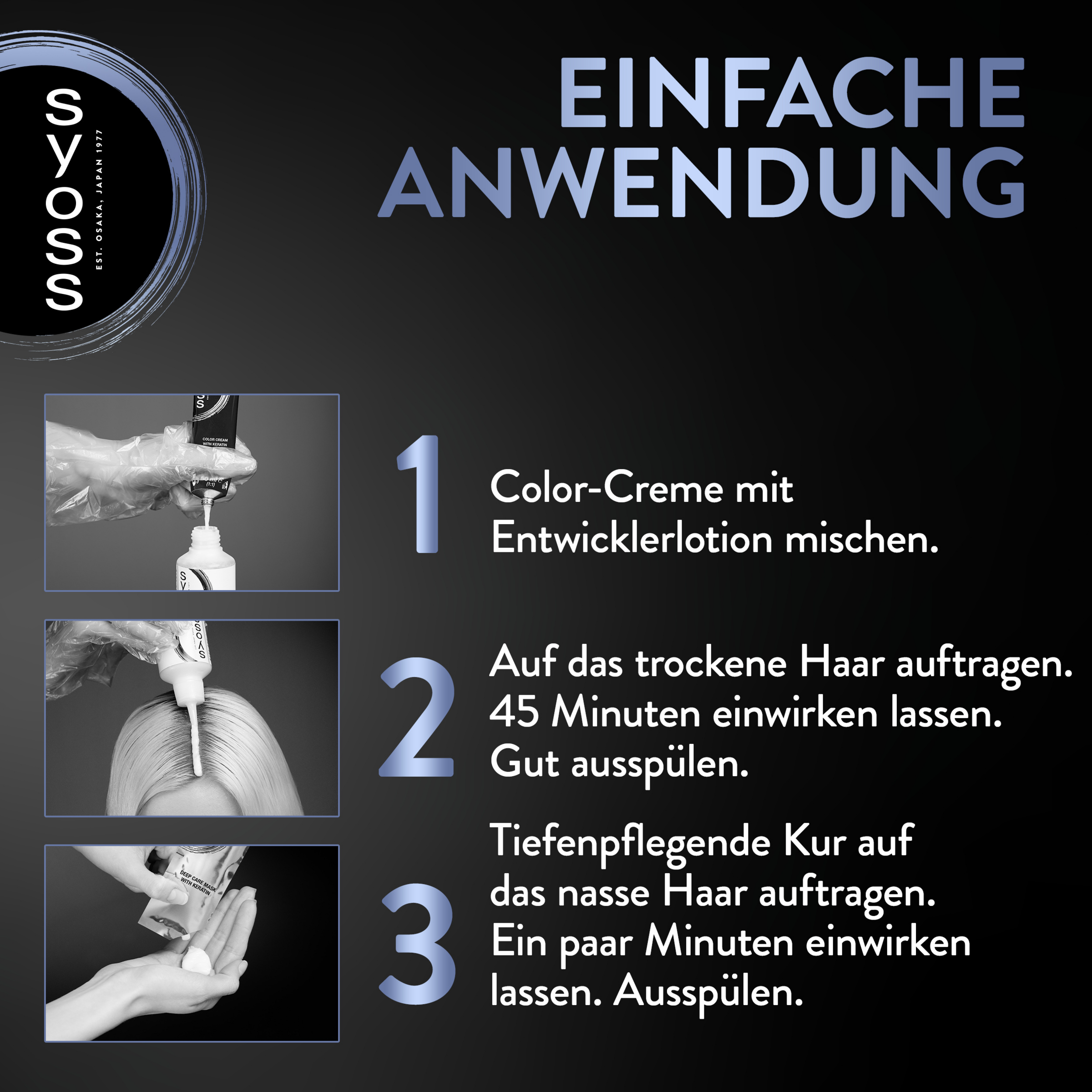 ACHTUNG, BITTE VOR DER ANWENDUNG BEACHTEN, bitte lies die Sicherheitshinweise auf der Rückseite der Gebrauchsanweisung sorgfältig durch. Lege vor Beginn der Anwendung ein Handtuch und eine Uhr in die Nähe, um die Einwirkzeit zu überwachen. SYOSS COLOR dürfen nur auf trockenem, nicht vorgewaschenem Haar angewendet werden.