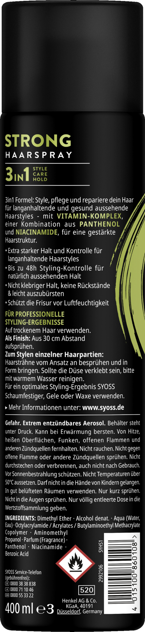 - Strong – Das SYOSS Haarspray mit 3in1 Formel stylt, pflegt und repariert dein Haar und verleiht extra starken Halt mit bis zu 48h Styling-Kontrolle
