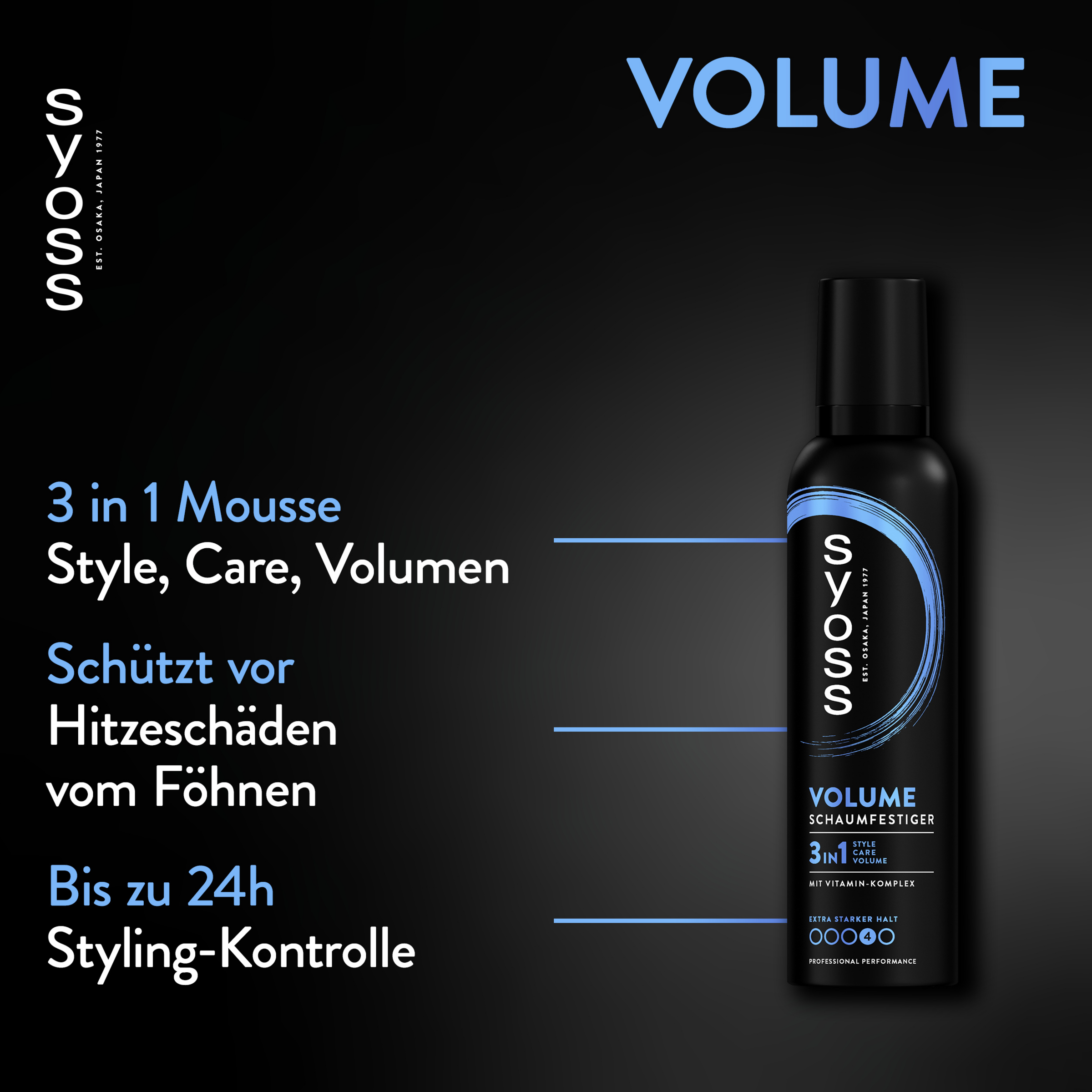 SYOSS Schaumfestiger Volume Haltegrad 4 Extra Stark – Intensives Volumen & Anti-Platt-Effekt. Der Schaumfestiger mit 3in1 Formel stylt, pflegt und repariert dein Haar. Er verleiht intensives Volumen und einen Anti-Platt-Effekt für langanhaltendes Volumen vom Ansatz an. Der Haarfestiger bietet bis zu 24h Styling-Kontrolle für natürlich aussehenden Halt, Schutz vor Föhnschäden sowie vor Luftfeuchtigkeit und Frizz. Mit Vitamin-Komplex, einer Kombination aus Panthenol und Niacinamide, sorgt der Schaumfestiger für eine gestärkte Haarstruktur. Dabei verklebt der Schaum nicht und hinterlässt keine Rückstände. Im Anschluss kann der Föhnschaum ohne Rückstände leicht ausgebürstet werden.