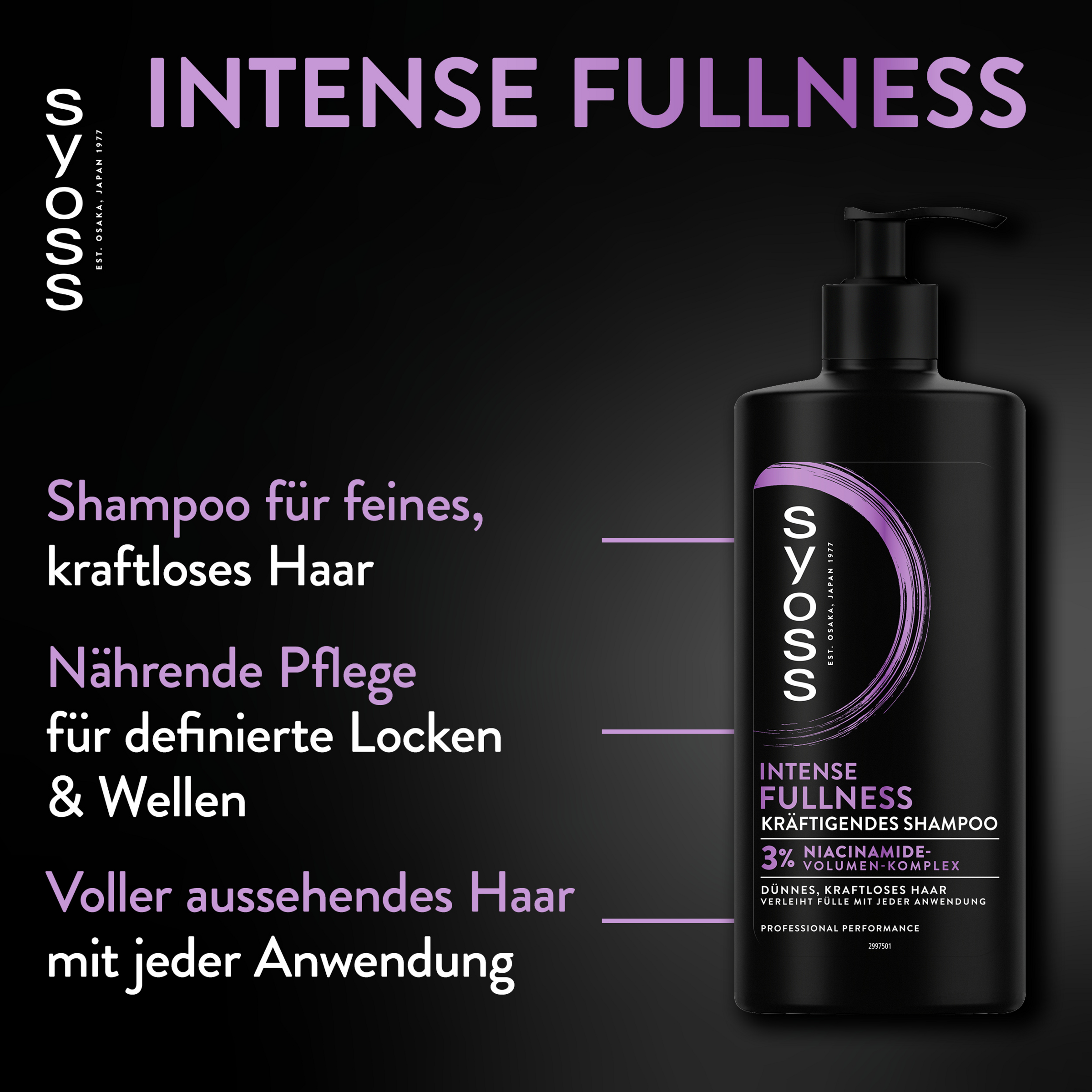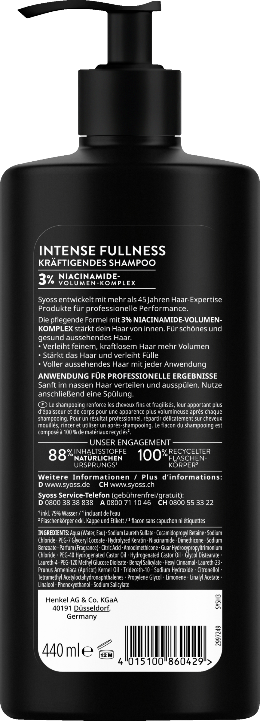SYOSS Shampoo Intense Fullness – Kräftigendes Shampoo für feines, kraftloses Haar mit Niacinamide-Volumen-Komplex Das SYOSS Intense Fullness Shampoo eignet sich für feines und kraftloses Haar und verleiht ihm Fülle mit jeder Anwendung. Es kombiniert pflegende Inhaltsstoffe mit einem 3% Niacinamide-Volumen-Komplex. Das Shampoo stärkt die Haare von innen und sorgt so für mehr Volumen. Die Formel enthält 88% Inhaltsstoffe natürlichen Ursprungs inklusive Wasser und der Flaschenkörper des Shampoos besteht aus 100% recyceltem Plastik (Kappe ausgenommen). SYOSS entwickelt mit mehr als 45 Jahren Haar-Expertise Produkte für professionelle Performance.