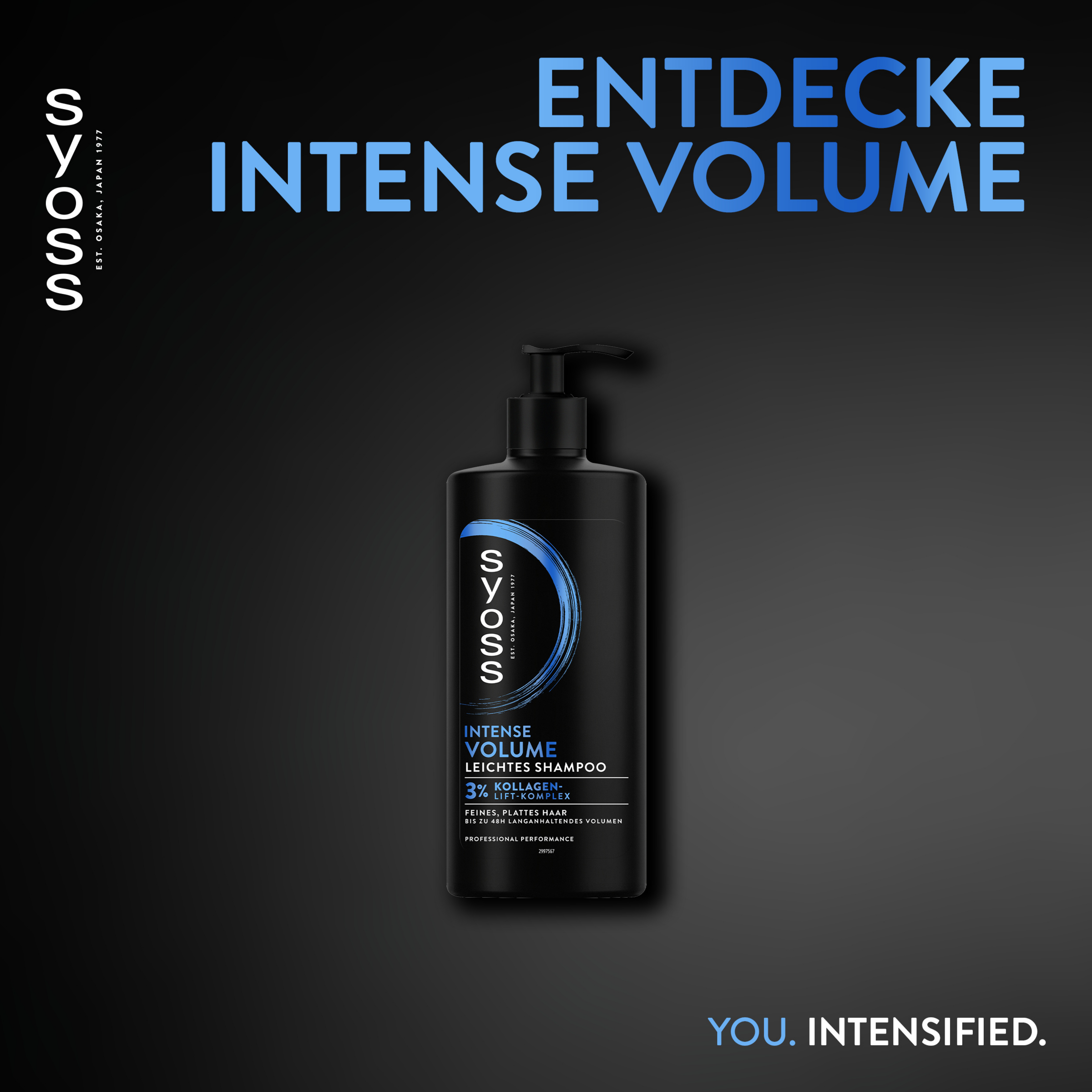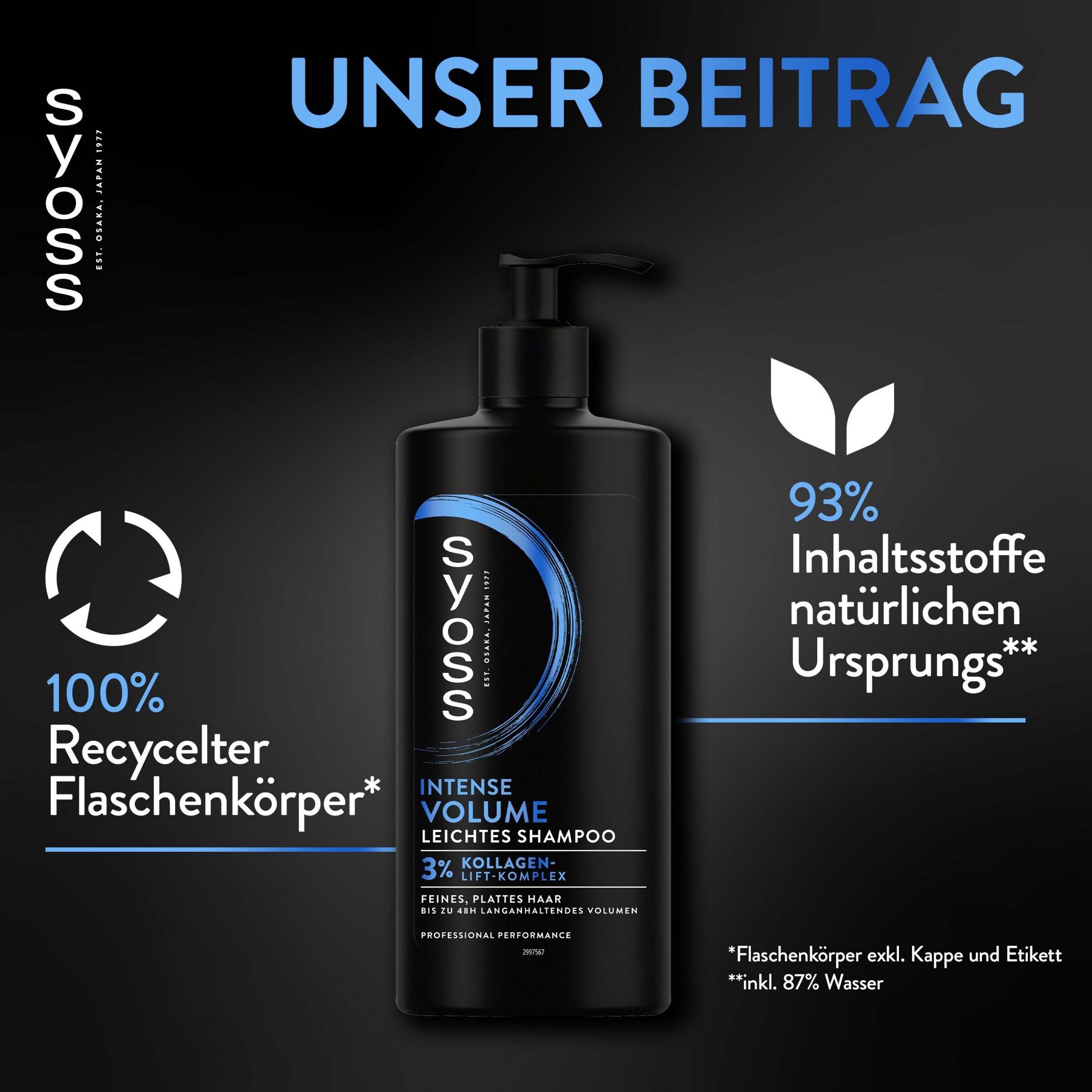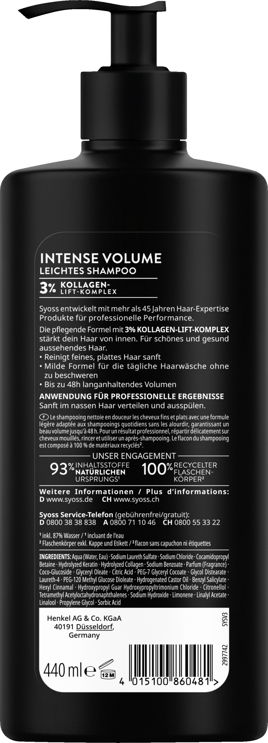 SYOSS Shampoo Intense Volume – Leichtes Shampoo für feines, plattes Haar mit Kollagen-Lift-Komplex Das SYOSS Intense Volume Shampoo reinigt feines und plattes Haar sanft und verleiht bis zu 48 h Volumen. Es kombiniert pflegende Inhaltsstoffe mit einem 3% Kollagen-Lift-Komplex und stärkt die Haare von innen. Dank seiner milden Formel eignet sich das Shampoo für die tägliche Haarwäsche. Die Formel enthält 93% Inhaltsstoffe natürlichen Ursprungs inklusive Wasser und der Flaschenkörper des Shampoos besteht aus 100% recyceltem Plastik (Kappe ausgenommen). SYOSS entwickelt mit mehr als 45 Jahren Haar-Expertise Produkte für professionelle Performance.