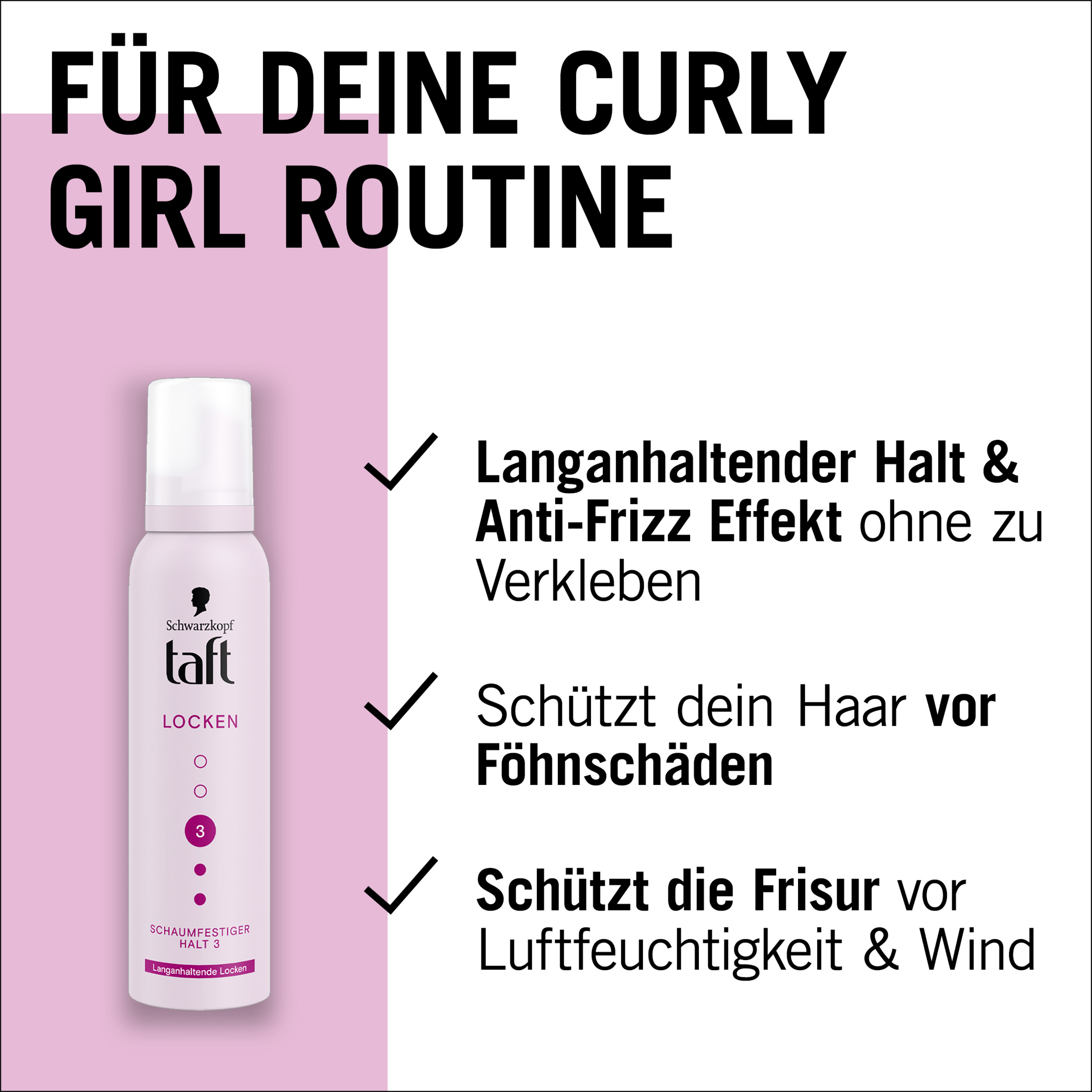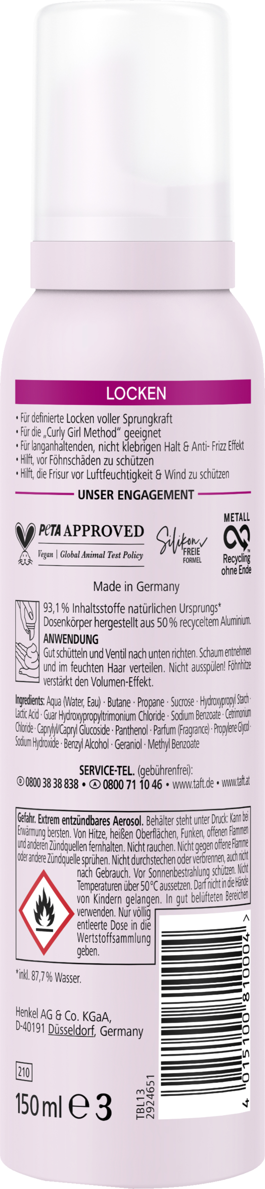 Die innovative Taft-Locken-Formel sorgt für langanhaltende und definierte Locken, voller Elastizität. Der Haarschaum bietet langanhaltenden Halt und einen Anti-Frizz-Effekt ohne zu verkleben. Der TAFT Schaumfestiger hilft, das Haar vor Föhnschäden zu schützen. Dieses Haarstyling-Produkt verleiht Frisuren starken Halt, selbst unter Wetterbedingungen wie Feuchtigkeit und Wind. TAFT Produkte verwenden vegane Formeln und sind von PETA zertifiziert. Die Formel ist frei von Silikonen. 93,1 % der Inhaltsstoffe stammen aus natürlicher Herkunft. Die Dose besteht zu 50% aus recyceltem Aluminium.