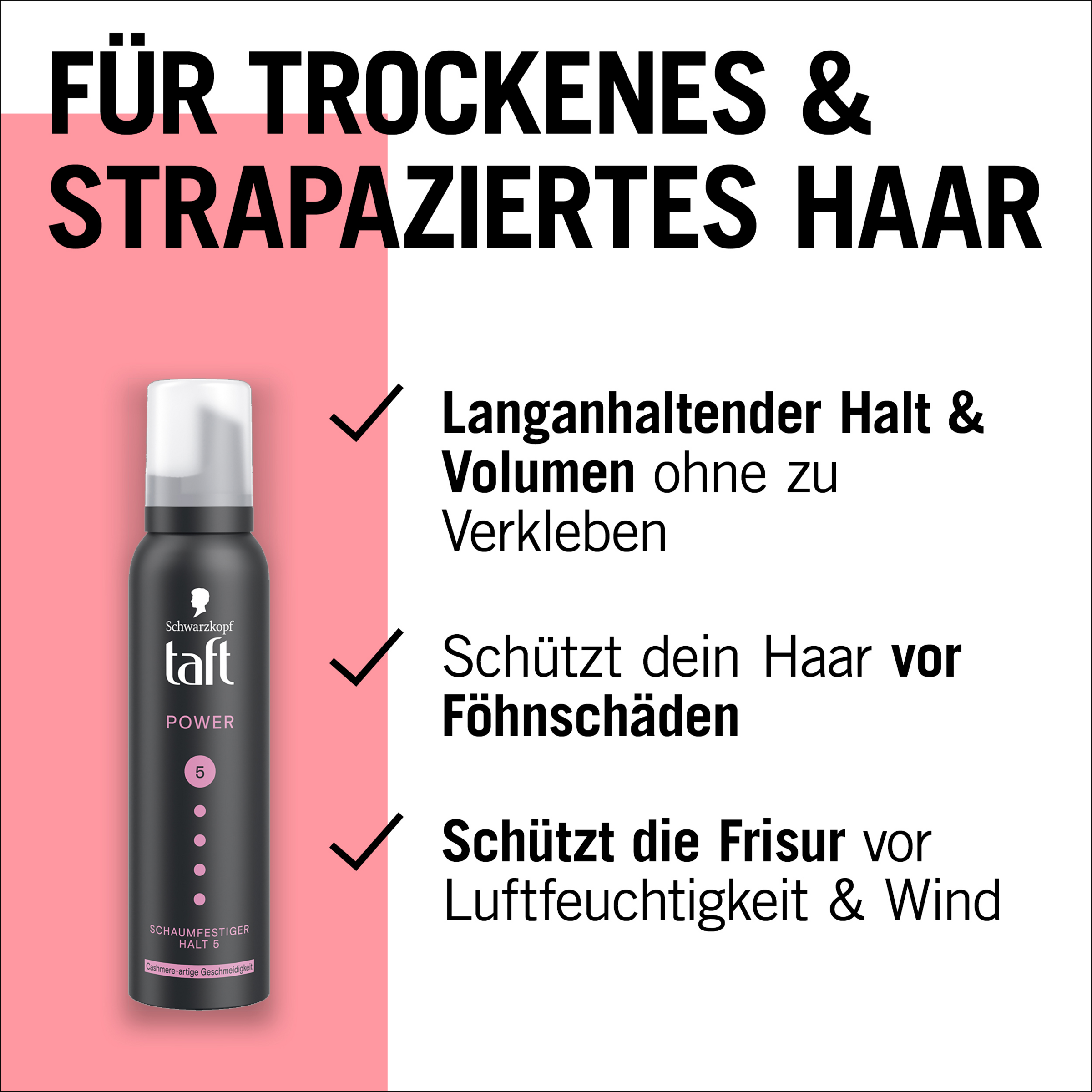 Die innovative Taft-Power-Formel verleiht ein weiches, kaschmirähnliches Haargefühl, besonders bei trockenem und geschädigtem Haar. Er bietet langanhaltenden Halt und Volumen ohne zu verkleben. Der TAFT Schaumfestiger hilft, das Haar vor Föhnschäden zu schützen. Dieses Haarstyling-Produkt verleiht starken Halt, selbst unter Wetterbedingungen wie Feuchtigkeit und Wind. TAFT Produkte verwenden vegane Formeln und sind von PETA zertifiziert. Die Formel ist frei von Silikonen. 92,8 % der Inhaltsstoffe stammen aus natürlicher Herkunft. Die Dose besteht zu 50% aus recyceltem Aluminium.