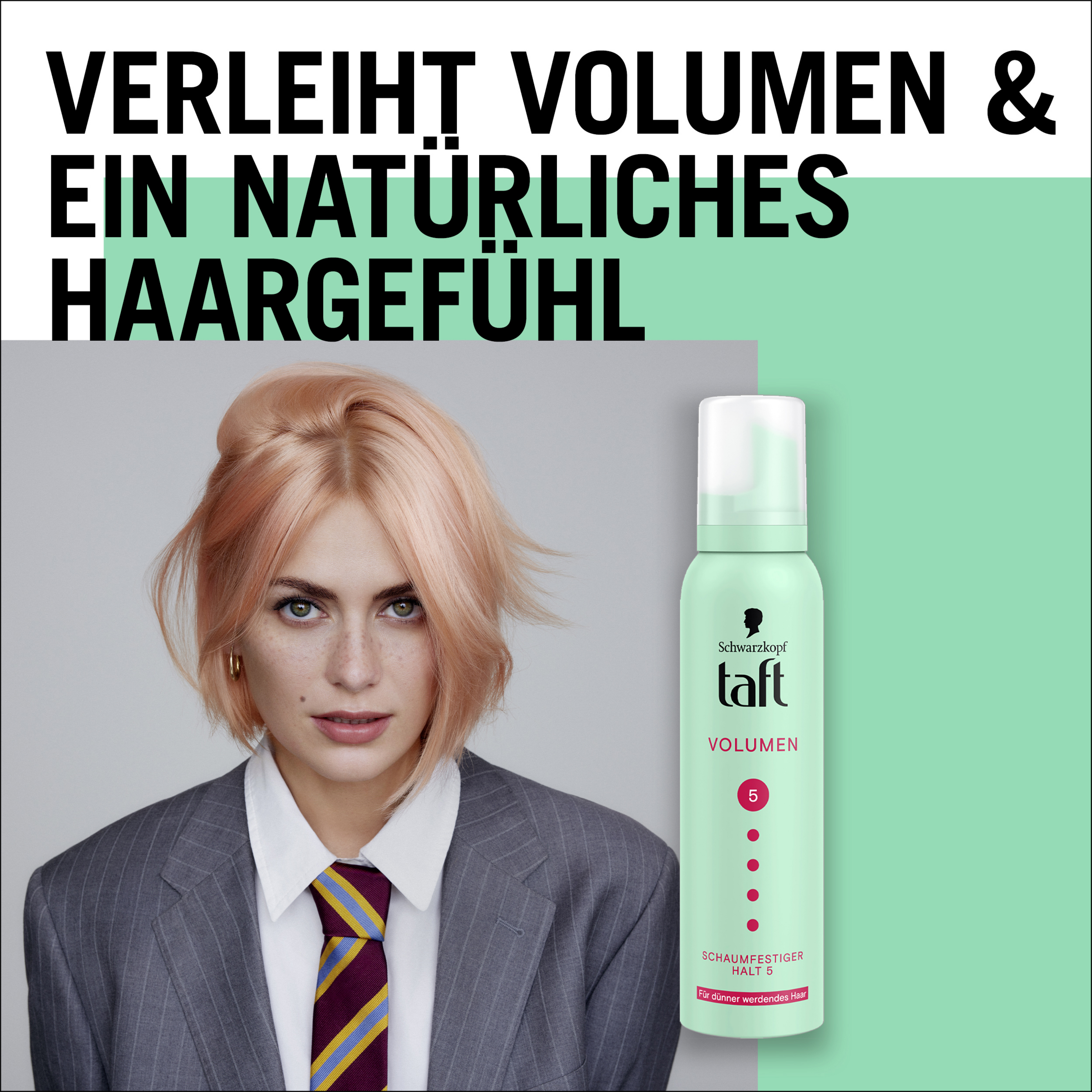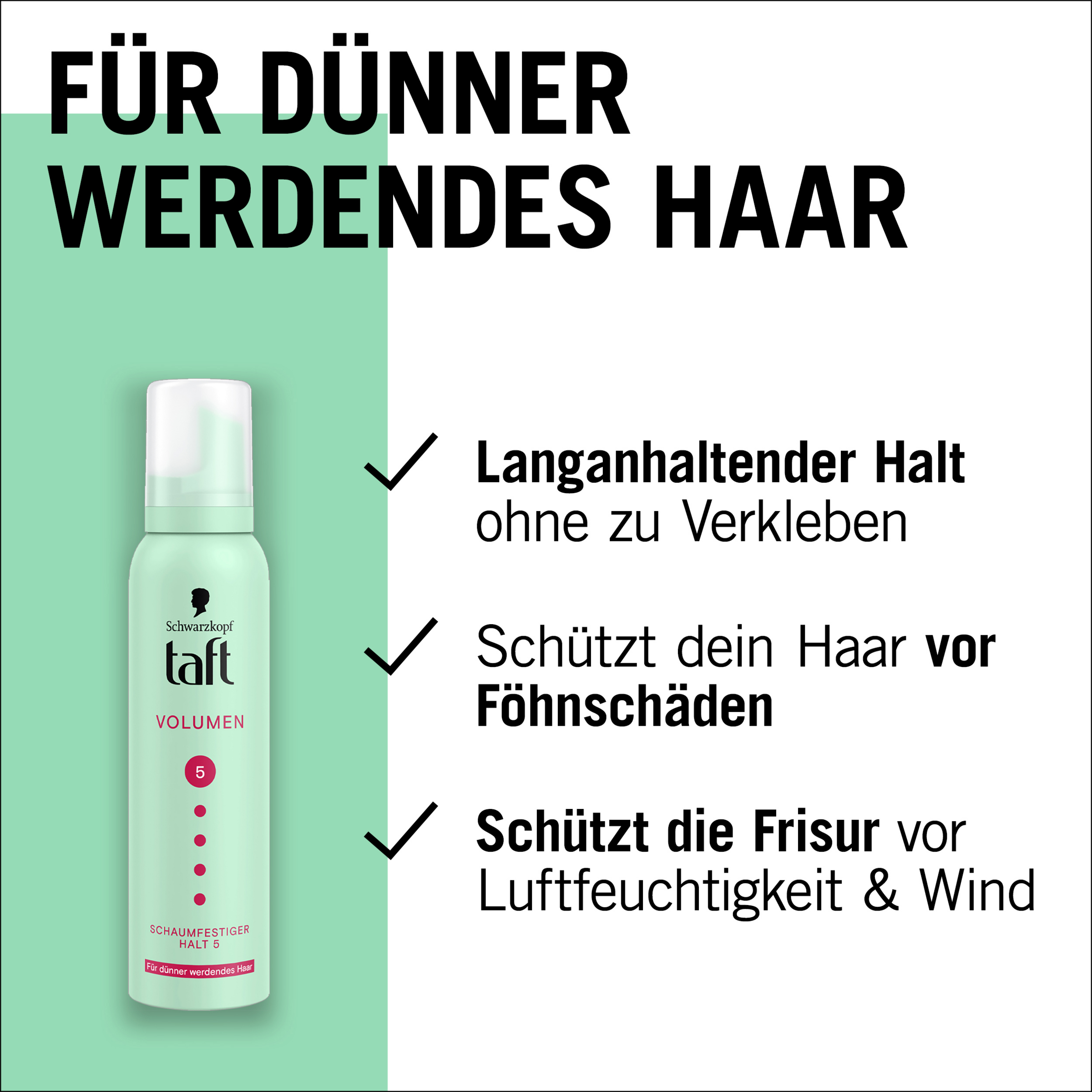Bei dünner werdendem & feinem Haar verleiht der Schaumfestiger von TAFT Volumen, Griffigkeit und Halt. Zudem wird für voluminöse Haarstylings der Haarschwung verbessert. Der Haarfestiger sorgt 24 Stunden für extra starken Halt und kann rückstandsfrei verwendet werden – ganz ohne zu verkleben oder die Haare zu beschweren. Das Volumen Mousse bietet mit Haltegrad 5 nicht nur langanhaltenden Halt, sondern schützt das Haar auch vor Föhnschäden, Wind und Wetter! Die Formel ist vegan und frei von Inhaltsstoffen tierischen Ursprungs.