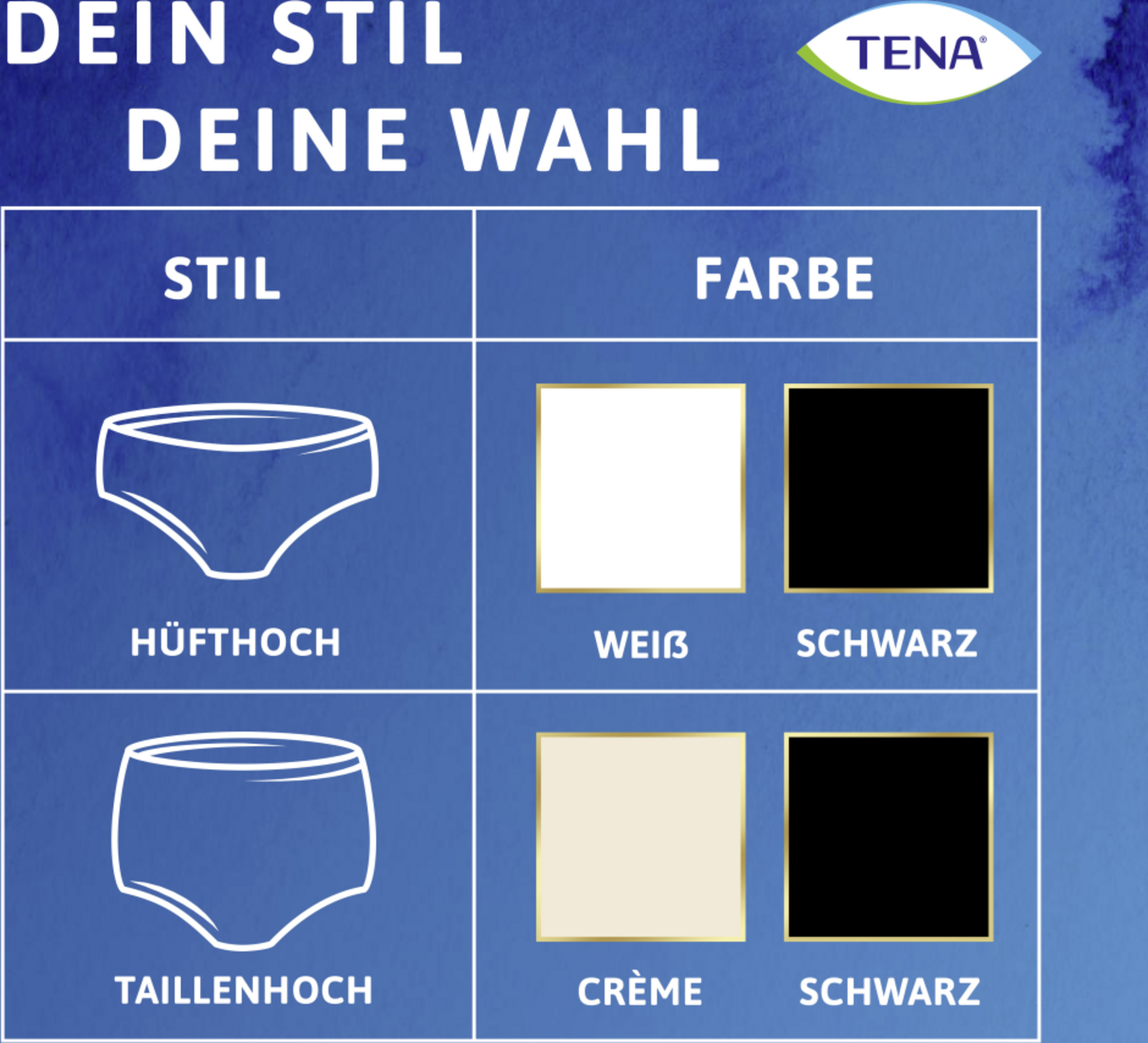 Ob für den täglichen Gebrauch, auf Reisen oder einfach nur zum Schlafen - mit dem bewährten, effektiven Einwegschutz fühlst du dich jederzeit sicher und selbstbewusst. Damit du das Design findest, das am besten zu dir passt, bietet das Sortiment eine Auswahl an weichen, figurbetonten Modellen in den Größen M und L. Wähle zwischen dem hüfthohen TENA Silhouette Plus Hipster-Modell, erhältlich in Schwarz und Weiß, und dem taillenhohen TENA Silhouette Plus Classic-Modell, erhältlich in Crème.